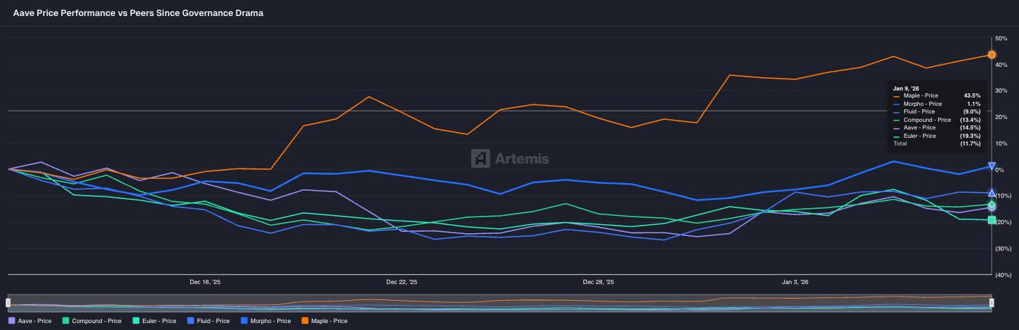 With the AAVE token down as much as 25% since the beginning of the infighting, its clear that many investors are grappling with the same question around control of a protocol. A protocol is much more than its smart contracts: its the brand, the front end, the social presence, and the partnerships. How the value that each creates is distributed is still being determined.
