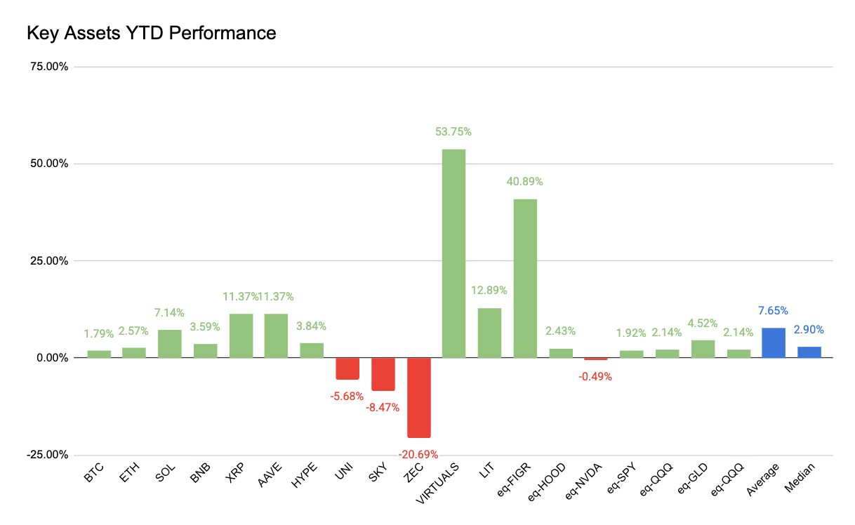 The market welcomed the new year with open arms (for the most part). BTC retook $90k, ETH climbed above $3k, and Gold pushed all time highs. Other L1s like SOL, BNB and XRP were up about 10% on average. Meanwhile, Figure opened the year up a staggering 42%, and Virtuals up 55% on AI sector growth. UNI opened the year down 5.68% in spite of the implementation of the UNIfication plan and ZEC dropped 20% on governance related drama.