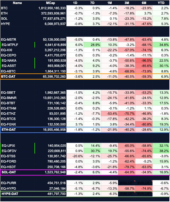 Solana-based DATs have emerged as the clear ecosystem leaders, posting an average return of approximately 17%. This strength is closely tied to the SOL token, which gained 7.8% year-to-date and outpaced its major layer-one competitors. In contrast, HYPE DATs have lagged behind with a disappointing average return of -0.9%.