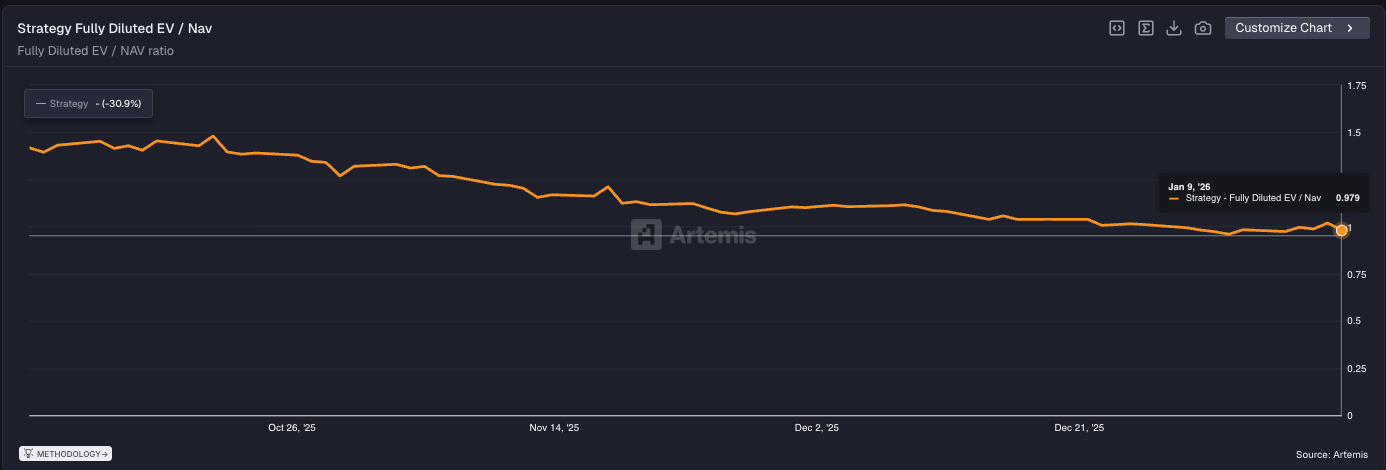 Strategy trades below a fully diluted mNAV of 1 for 9 of the last 30 days.