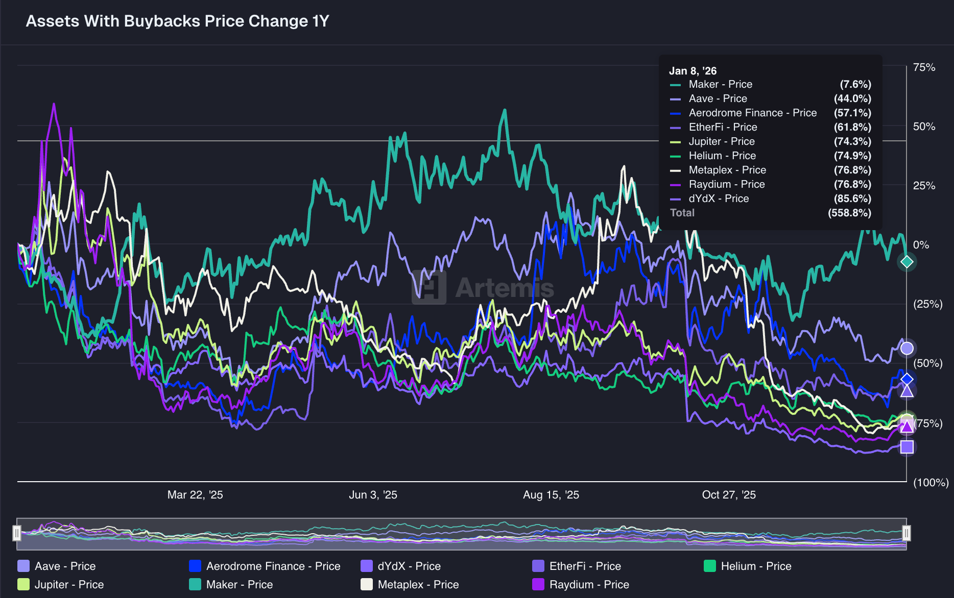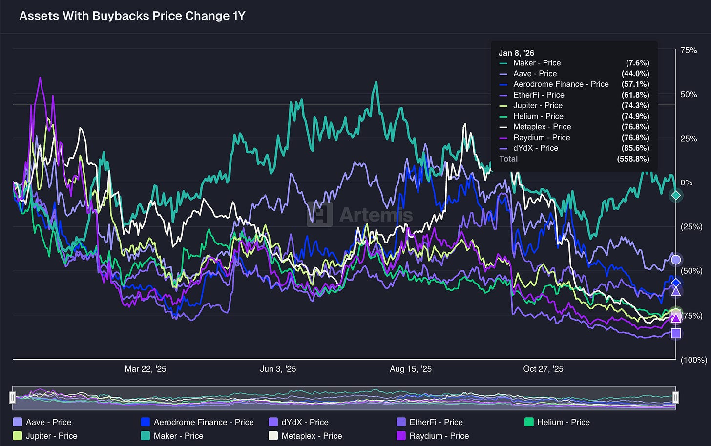 Amir and the Helium team ignited the conversation, and now, leaders in the space are second guessing the impact of buybacks. Notably, Jupiter founder Siong Ong posed the question to the community - should Jupiter stop doing buybacks? Among major protocols, Jupiter and Helium rank 2nd and 7th, respectively, for total buybacks since October 20th (when HNT buybacks began). Buybacks have typically been seen as a way to return value to tokenholders, since dividends put tokens in securities-violation territory. Siong and Amir both noted that buybacks have not meaningfully supported price over the past several months, and that the market does not seem to be rewarding this mechanism of value distribution. That thought is supported by the data: