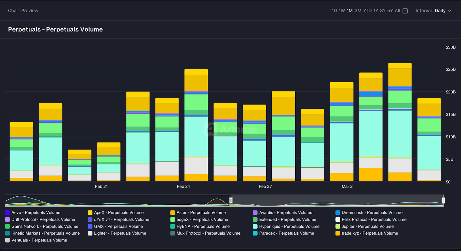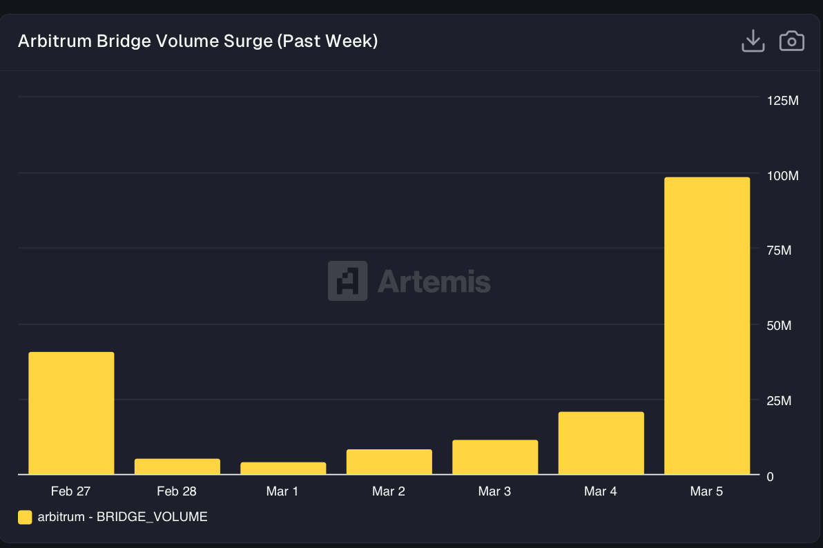Arbitrum bridge volume surge — Arbitrum experienced a dramatic bridge volume spike, exploding from $15.1M on February 26 to $98.8M on March 5, a staggering +554% increase. The surge accelerated dramatically in the final 48 hours, jumping from $21M to nearly $99M, suggesting higher Hyperliquid interest