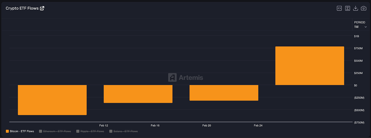 Going into the week, spot Bitcoin ETFs had bled $4.5 billion YTD across six consecutive weeks of outflows. Then the tape flipped: $1.7 billion in inflows since February 24, with March 5 marking the strongest single day since the outflow streak began (~$500 million, 10 of 11 funds positive). The reversal lasted one day, with $227.9 million in net outflows returned by end of session, but the inflows appear to be outright bullish bets rather than basis trades.