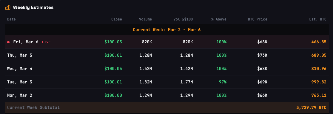 According to STRC tracking website strc.live, it is estimated that roughly 3,730 Bitcoin will be bought using purely STRC.