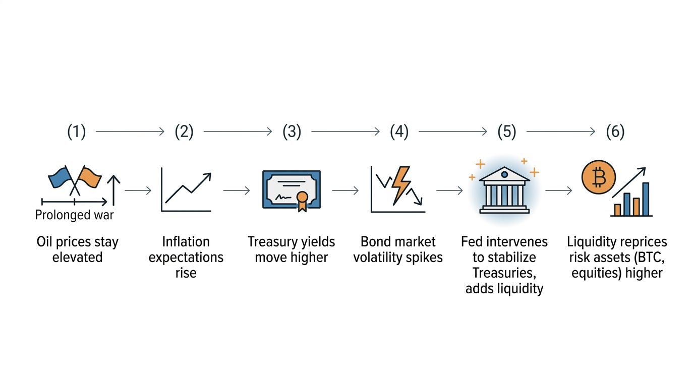 The oil-to-bond-volatility channel hasn’t triggered yet — the MOVE Index sits at ~75, well below the 130 level that has historically preceded Fed intervention. But Friday’s jobs miss opened a second path to the same destination: if the labor market is weakening, the Fed has cover to cut on growth grounds rather than waiting for a bond market dislocation. Both channels end with more liquidity — the difference is timing and the state of the economy when it arrives. The market is now pricing both possibilities simultaneously: oil-driven inflation risk that delays cuts, and labor market deterioration that accelerates them.