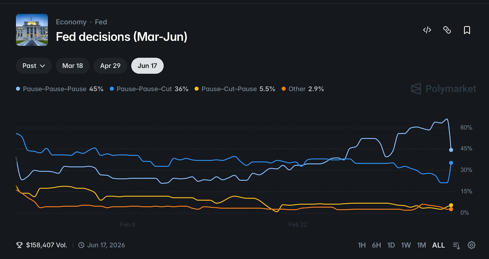 The pattern has precedent: the 1990 Gulf War, post-9/11, and the 2009 Afghanistan surge all coincided with Fed easing cycles. Brent is already up ~24% in a month to $85/bbl on Strait of Hormuz disruption, and the ISM manufacturing PMI came in at 52.4 for February, signaling expansion that complicates the near-term rate picture. Friday’s jobs miss (−92K, unemployment to 4.4%) shifted expectations forward, with June emerging as the earliest likely cut date and Polymarket odds for a June cut increasing.