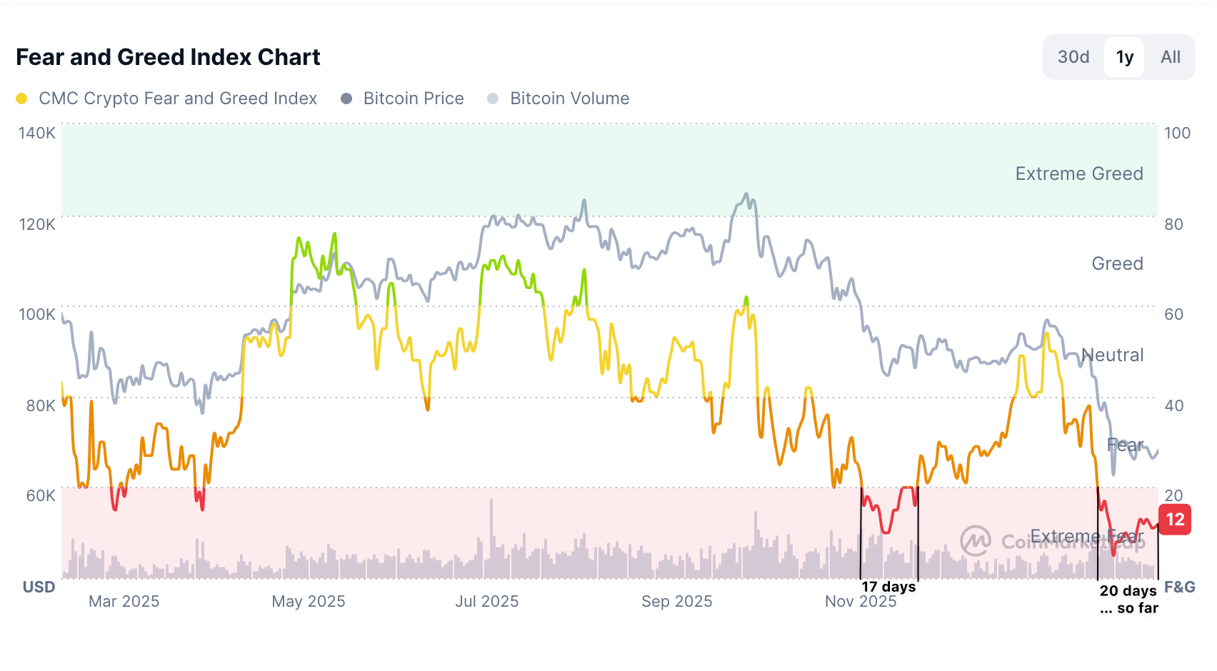 Fear and Greed Index — Crypto Fear and Greed Index extends its longest consecutive run in the “Extreme Fear” region at 20 days.