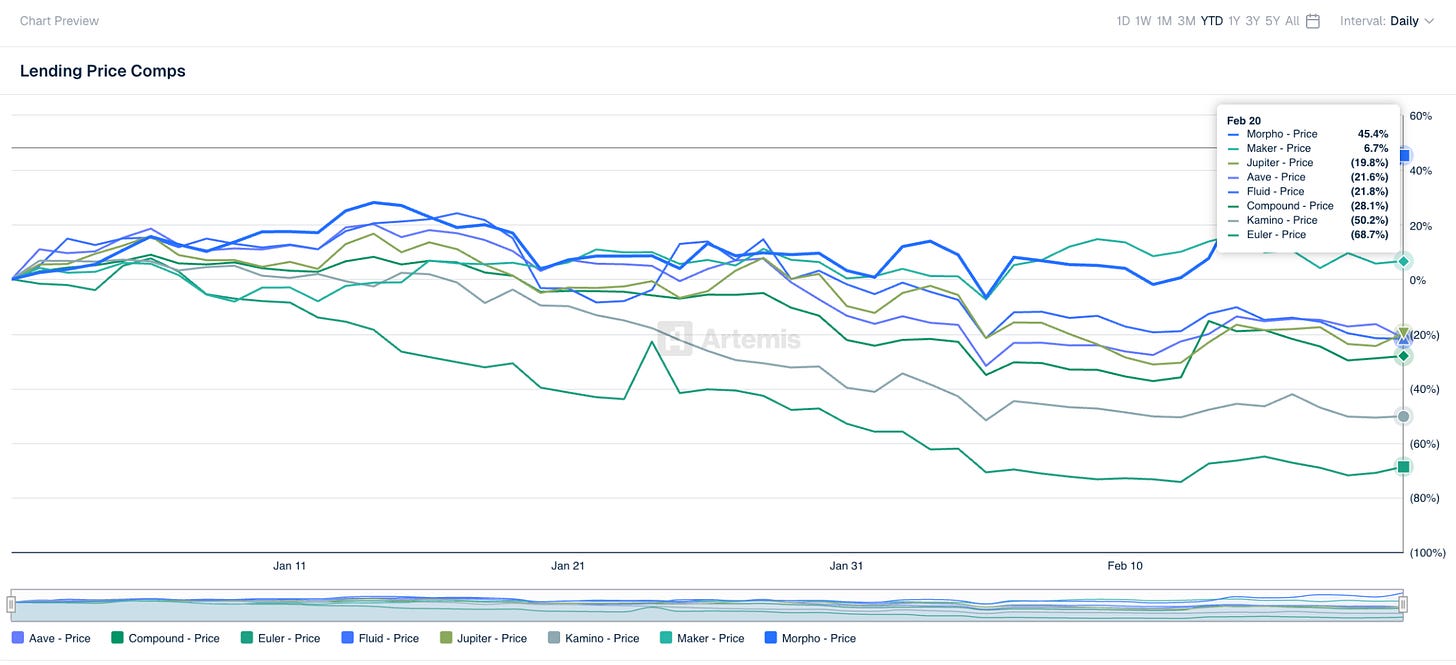 While most of the crypto market has been licking its wounds since October, MORPHO has been doing something unusual — going up. The token rebounded from a low of $0.97 on February 6 to around $1.54 today BanklessTimes, bucking the broader altcoin malaise. The move isn’t hard to explain: Morpho has spent the last several months accumulating a roster of institutional integrations that reads less like a DeFi protocol and more like a piece of core financial infrastructure. To put it into perspective, MORPHO is up 45% YTD, while its peers are down 20% or more.