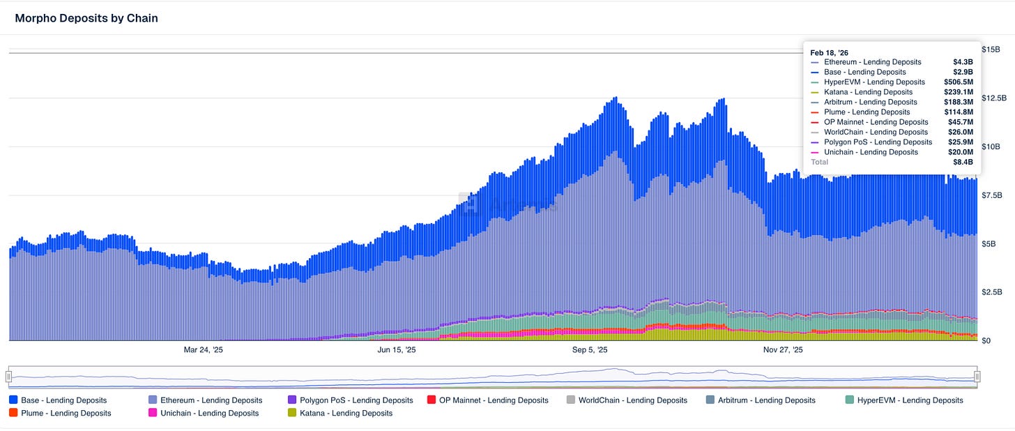 Morpho’s core bet is on becoming the lending infrastructure layer that exchanges, banks, and fintechs embed into their own products — invisibly, under the hood. In 2025, deposits climbed from $5B to $13B, and active loans hit $4.5B. Coinbase integrated Morpho to power its crypto-backed lending product. Gemini, Crypto.com, Bitget, and Ledger followed. Société Générale became the first regulated bank to use DeFi to extend its loan book, building lending markets for its MiCA-compliant stablecoins directly on Morpho. Then last week, most importantly, Apollo Global Management announced it would acquire up to 90 million MORPHO tokens over 48 months — a ~$112M commitment at current prices, structured to give one of the world’s largest alternative asset managers a direct governance stake in the protocol.