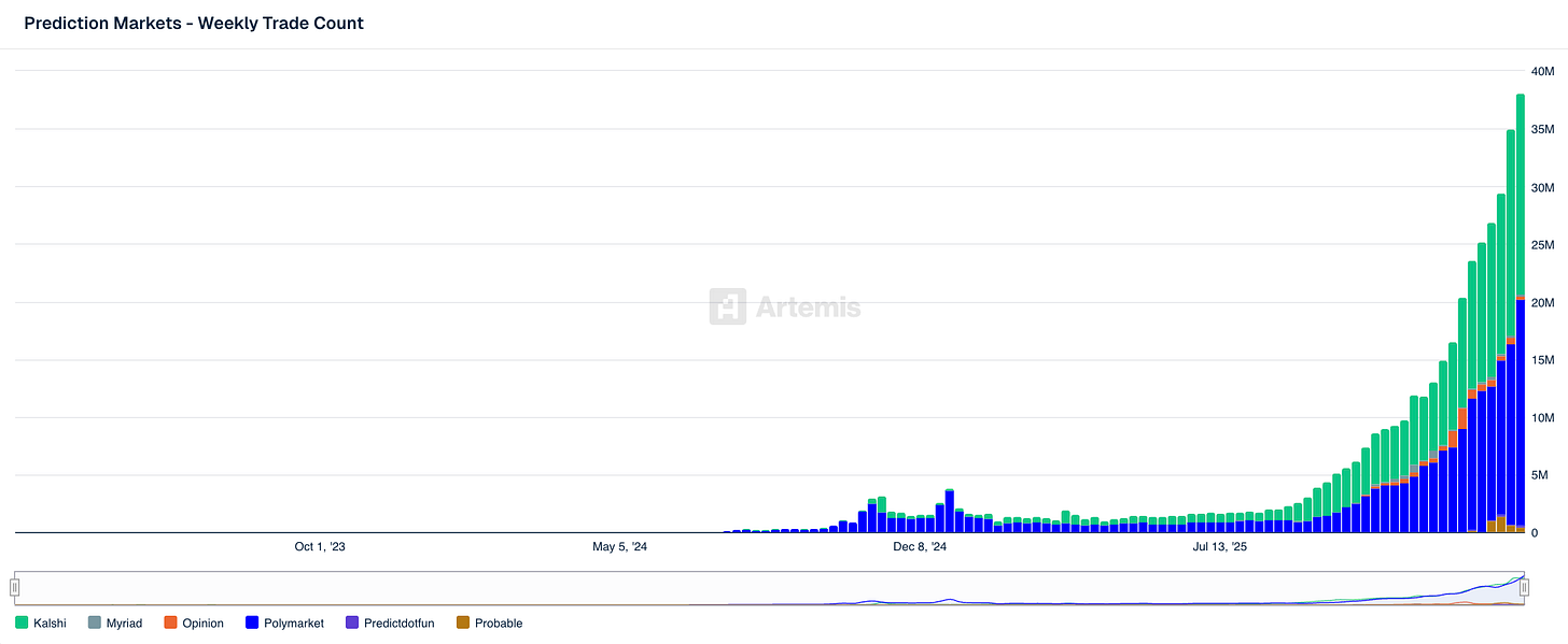 Prediction Market Usage Accelerates — No, this is not a cumulative chart, week over week prediction market trade counts continued to increase even after the Superbowl