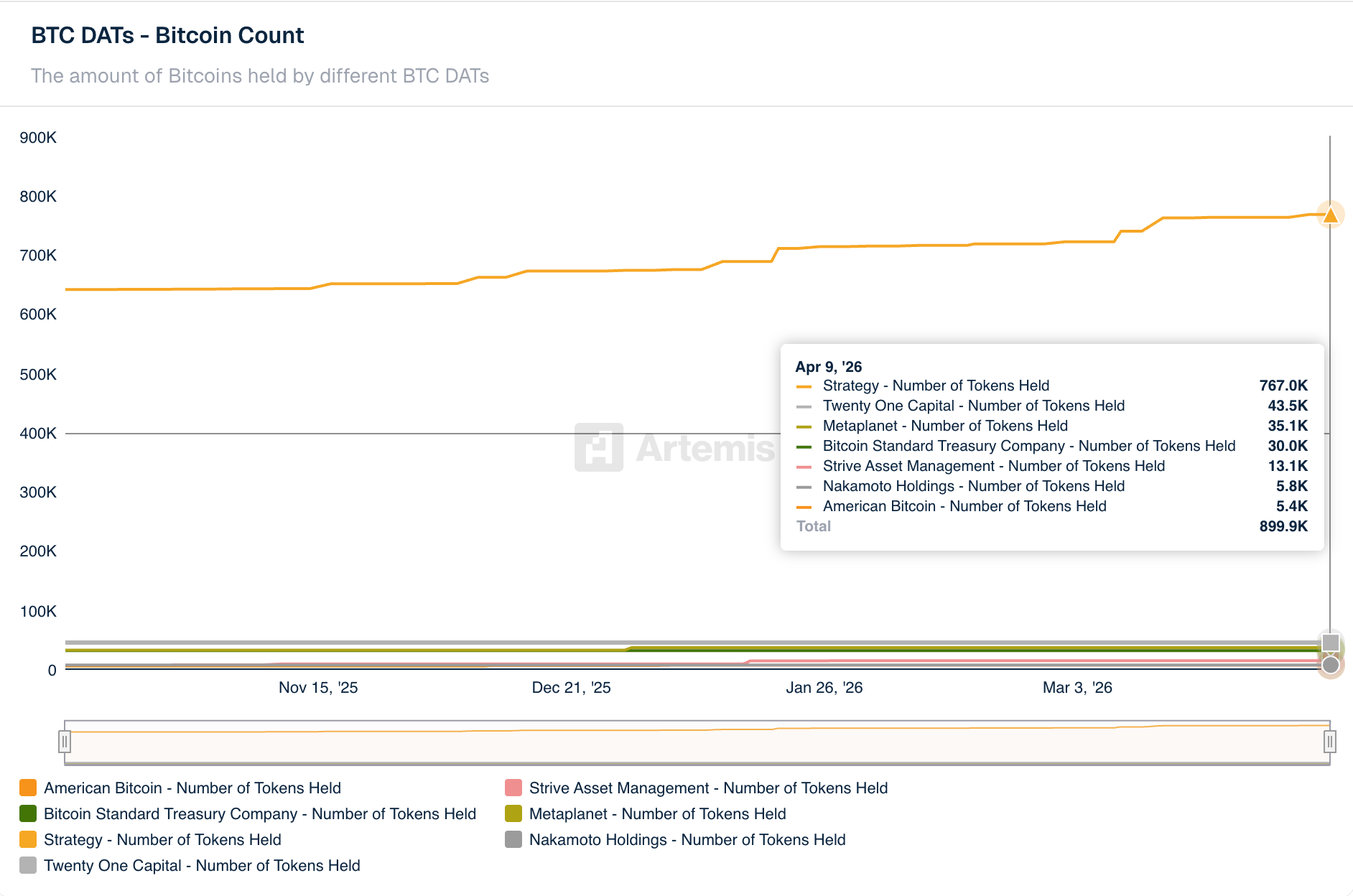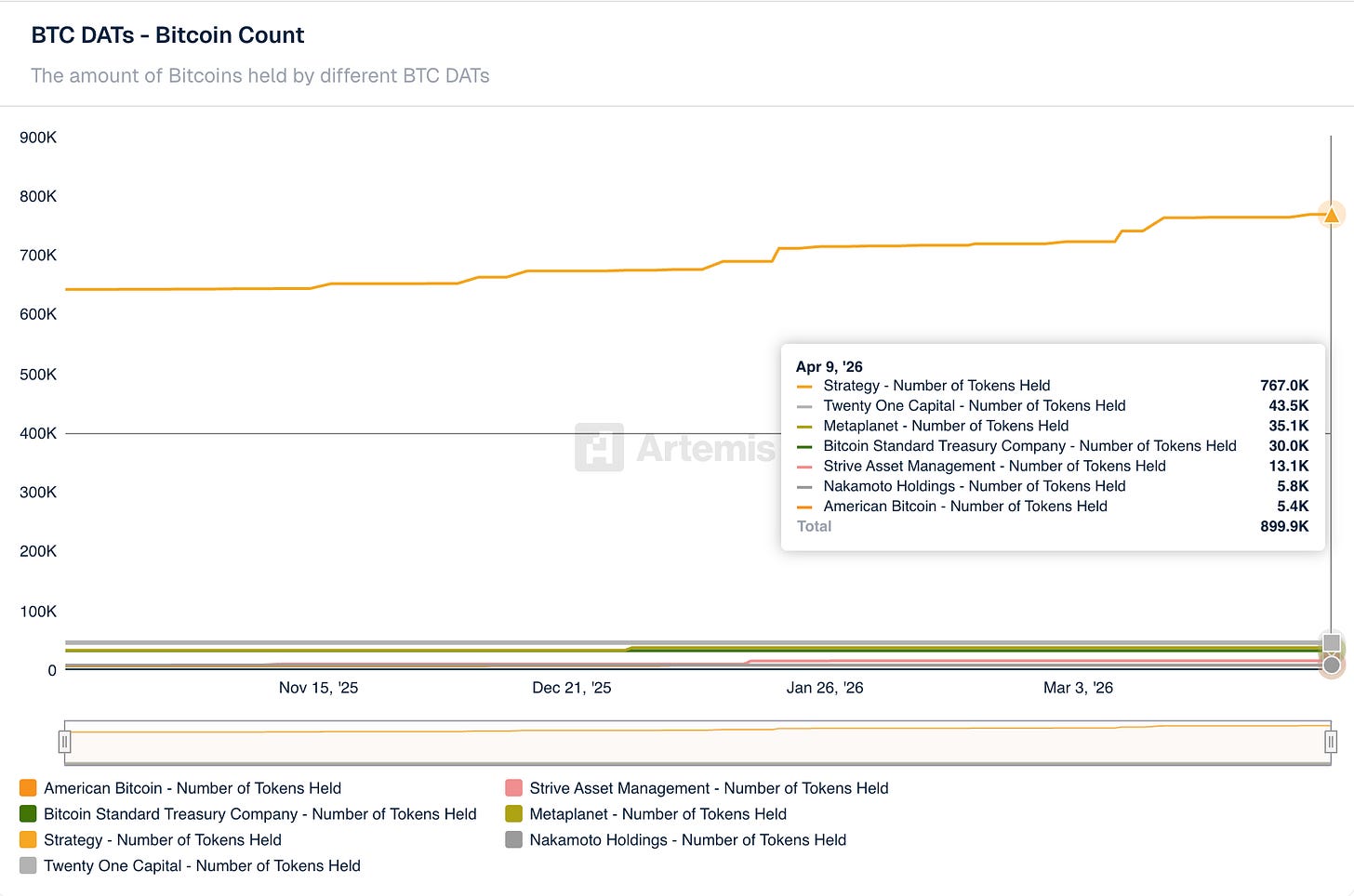 Strategy added another ~4,871 BTC early in the week, pushing its total to 767K BTC as of April 9 — extending its lead as the dominant corporate holder by a wide margin. The broader Digital Asset Treasury (DAT) cohort now collectively holds ~899.9K BTC across seven tracked entities, approaching the psychologically significant 900K mark. That's roughly 4.3% of total Bitcoin supply sitting on corporate balance sheets.