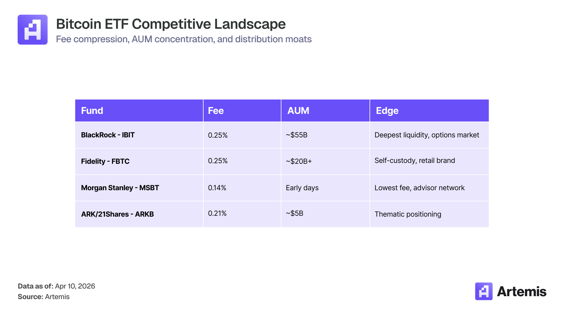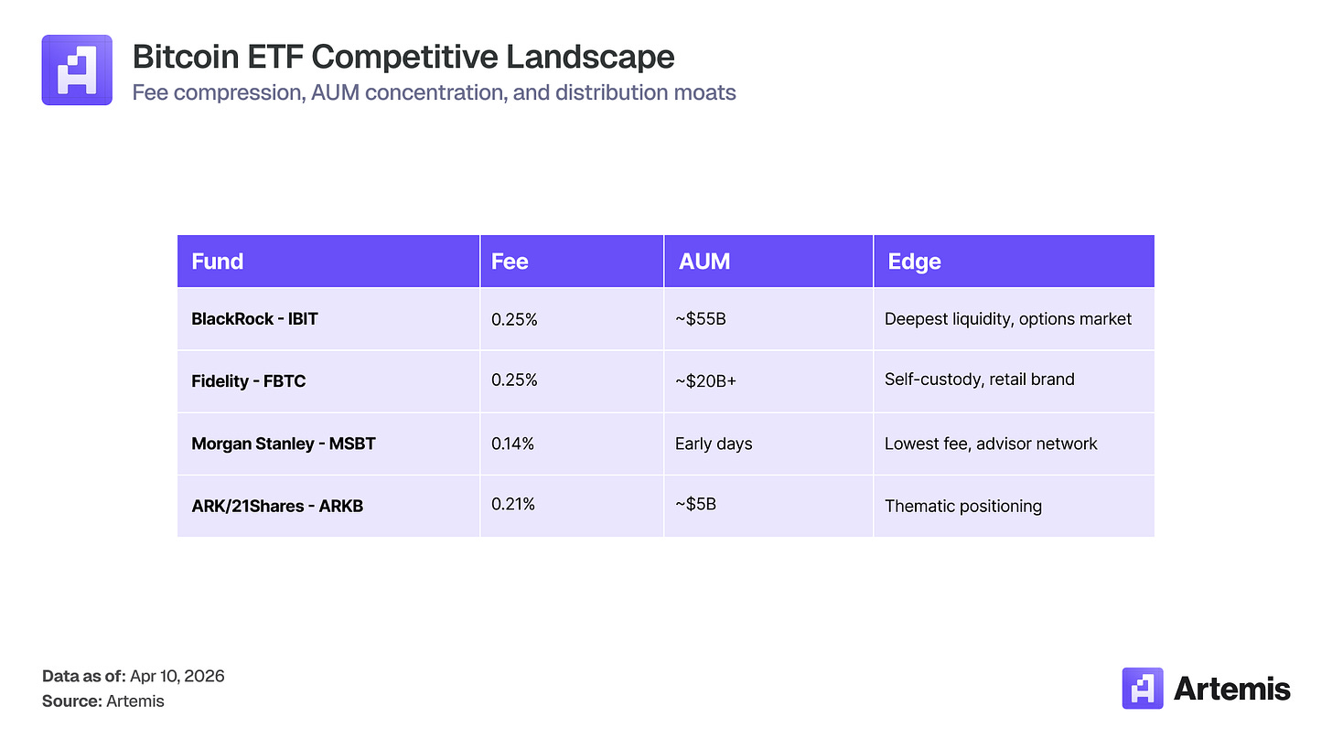 MSBT launches at 0.14% — 11 basis points below BlackRock's IBIT at 0.25%. On a $100K investment that's $110/year in savings. Narrow in absolute terms, but it sets a new floor. Fee compression in Bitcoin ETFs is accelerating, and Morgan Stanley just fired the loudest shot yet.