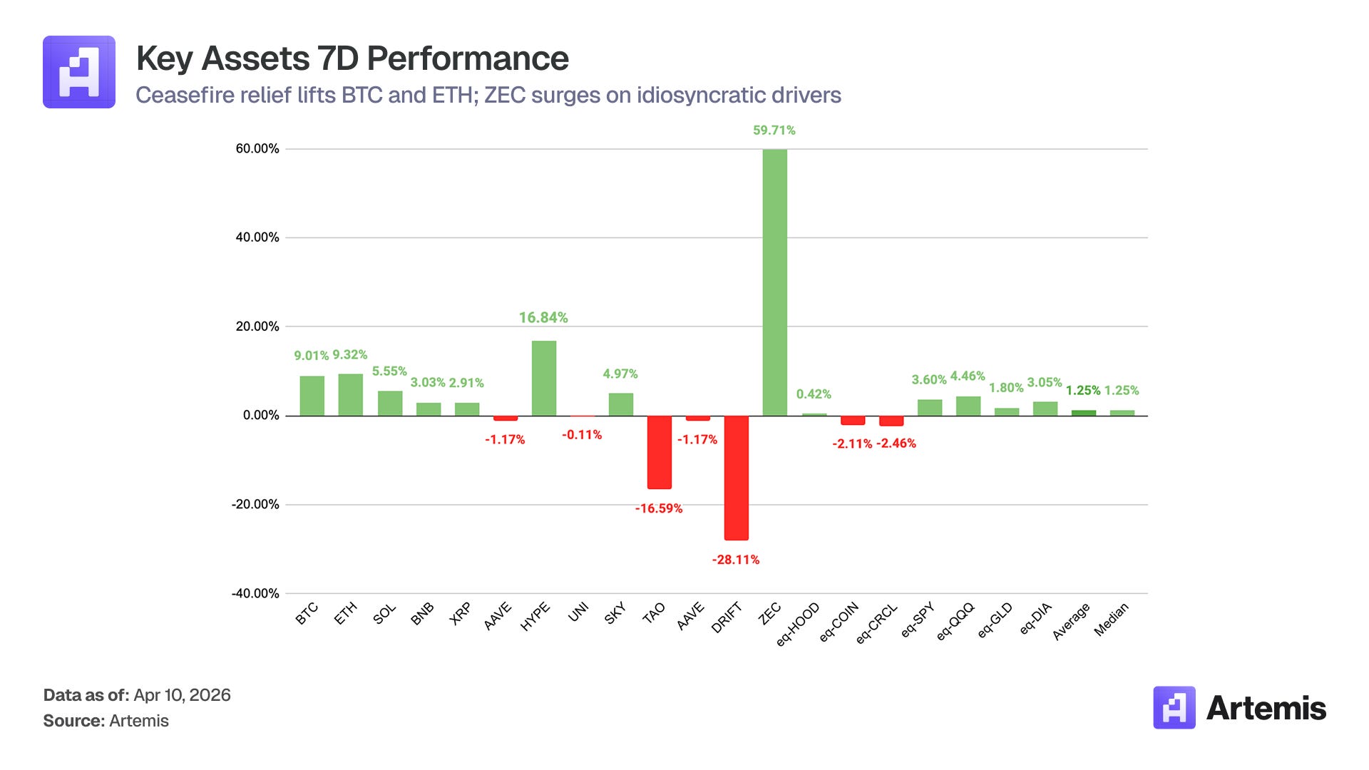 Crypto finally caught a bid. BTC surged from ~$68K to ~$72.7K on the ceasefire news, finishing the week up ~9% and triggering nearly $600M in leveraged liquidations — over $400M from shorts that had piled in during weeks of range-bound drift. ETH gained ~9.3% on the week. The standout was ZEC, up a striking +59.7%, though on idiosyncratic rather than macro drivers. HYPE continued its strong run, up +16.8%, while SKY gained +4.97%. On the losing side, DRIFT extended its post-exploit collapse, down another -28.1% on the week following the $285M April 1 hack, and TAO gave back -16.59% after its recent surge. Equities proxies tracked closely with the relief rally: eq-COIN +3.6%, eq-QQQ +4.46%, while eq-HOOD (-2.11%) and eq-CRCL (-2.46%) lagged on continued CLARITY Act yield-ban uncertainty.