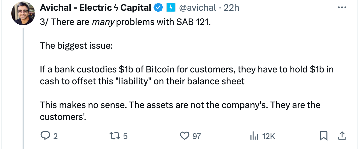 This guidance is important and relevant to the blockchain industry because it adds regulatory hurdles to financial institutions wishing to offer crypto products. The regulation specifically applies to entities registered with the SEC, or looking to register with the SEC, including major banks looking to make plays in the blockchain industry such as BNY Mellon. Avichal Garg from Electric Capital elucidates the issues with an example: