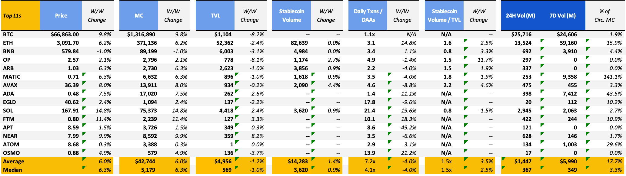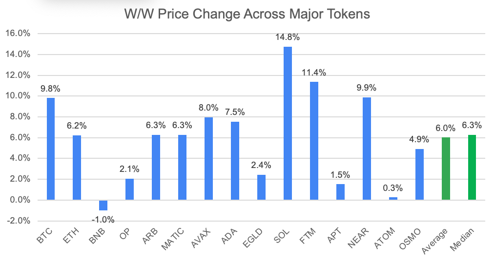 This week saw the market rebound, with average prices across major tokens up 6% WoW. Alternative Layer 1s like Solana, Fantom and Near were this weeks top gainers, posting WoW gains of 14.8%, 11.4% and 9.9%, respectively. Meanwhile, Aptos and Cosmos greatly underperformed this week (up 1.5% and 0.3%, respectively), while BNB was the only token to end down on the week. The recent market uptrend was in part caused in part by a lighter than expected CPI print and positive investor sentiment as important crypto legislation passed the Senate this week.