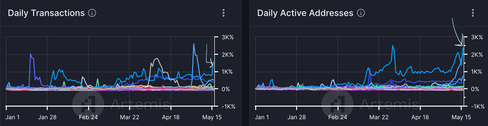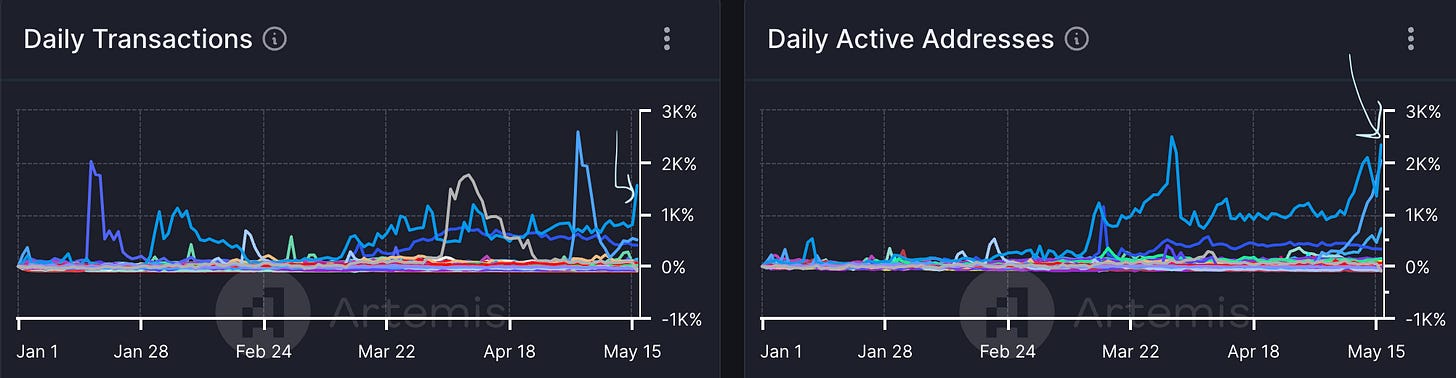 The charts above depict TON’s massive growth this year relative to other blockchains. Daily transaction counts are up 1600% since the start of the year, while daily active addresses are up 2,300%.