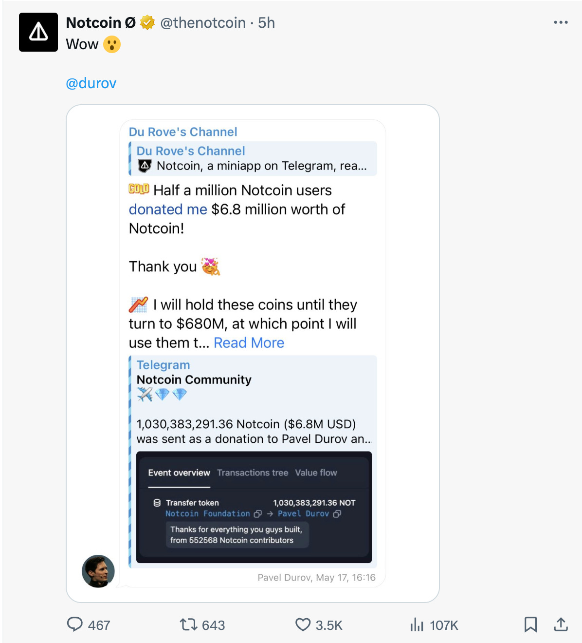 On Thursday the $NOT token was airdropped to players of the game. The airdrop saw daily transaction spike on TON from 3.9M to 7.2M. The token was distributed to all players, called ‘miners’, in a fair launch that aimed to imitate Bitcoin. The token launched with a fully diluted valuation of ~$1B, and has since traded down to ~$700m. Since the airdrop, $6.8m worth of $NOT has been sent from half a million addresses to Pavel Durov, the founder of Telegram.