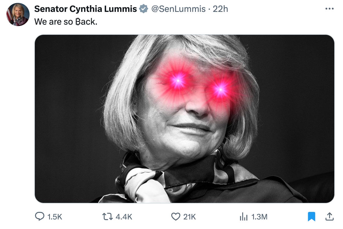 Republican Senator Cynthia Lummis tweeted the following image after the bill to repeal SAB 121 passed the Senate with greater-than-expected bipartisan backing.