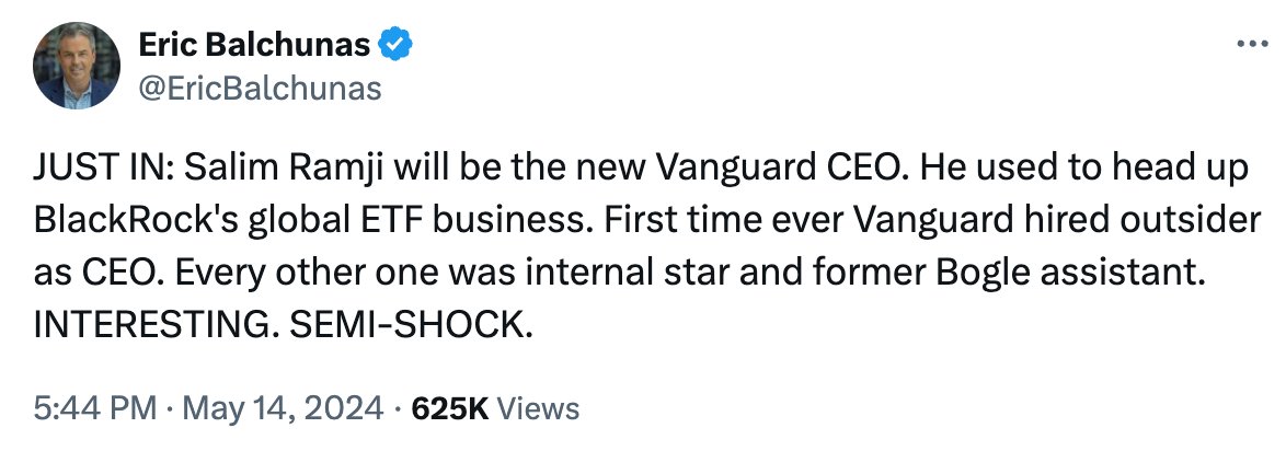 In other news, Vanguard is set to appoint Salim Ramji, a former BlackRock executive, as its new CEO. Ramji, who previously led BlackRock's iShares and index investments, will assume his role on July 8, 2024. This move is seen as a strategic effort by Vanguard to strengthen its leadership with experienced ETF expertise. Ramji's appointment follows his departure from BlackRock in January 2024. Vanguard has historically been staunchly anti-crypto, and this hiring may signal their openness to exploring a Bitcoin product. This is also the first time Vanguard has hired an outsider as CEO. See this video for more on Mr. Ramji’s view on blockchain.