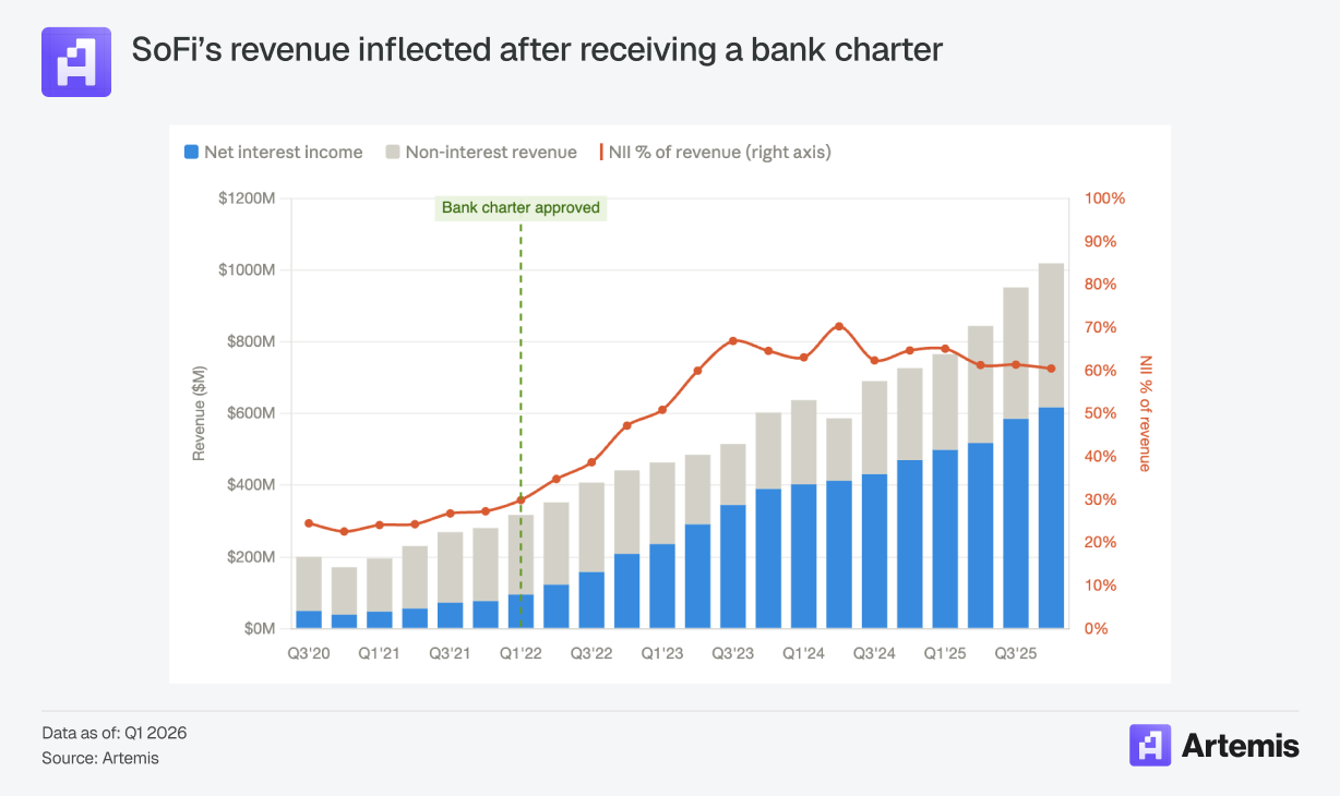 NuBank, already a chartered bank in Brazil, received conditional approval for a US national banking charter by the OCC in January 2026, while Revolut applied for a full banking charter in March 2026 (immediately after receiving its UK banking charter). SoFi has been a chartered bank since 2022 and the effect on its business has been dramatic, growing quarterly net interest income from $94.9M to $617M in four years.