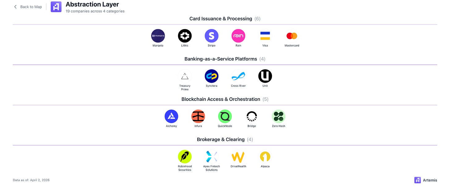 The raw rails are where value moves, but they are complicated and often gated. Most companies don’t want to get bank charters in order to integrate directly with Fedwire, and they don’t want to manage Ethereum node infrastructure. The abstraction layer exists to solve this. These are the companies that sit on top of the rails and make them usable.