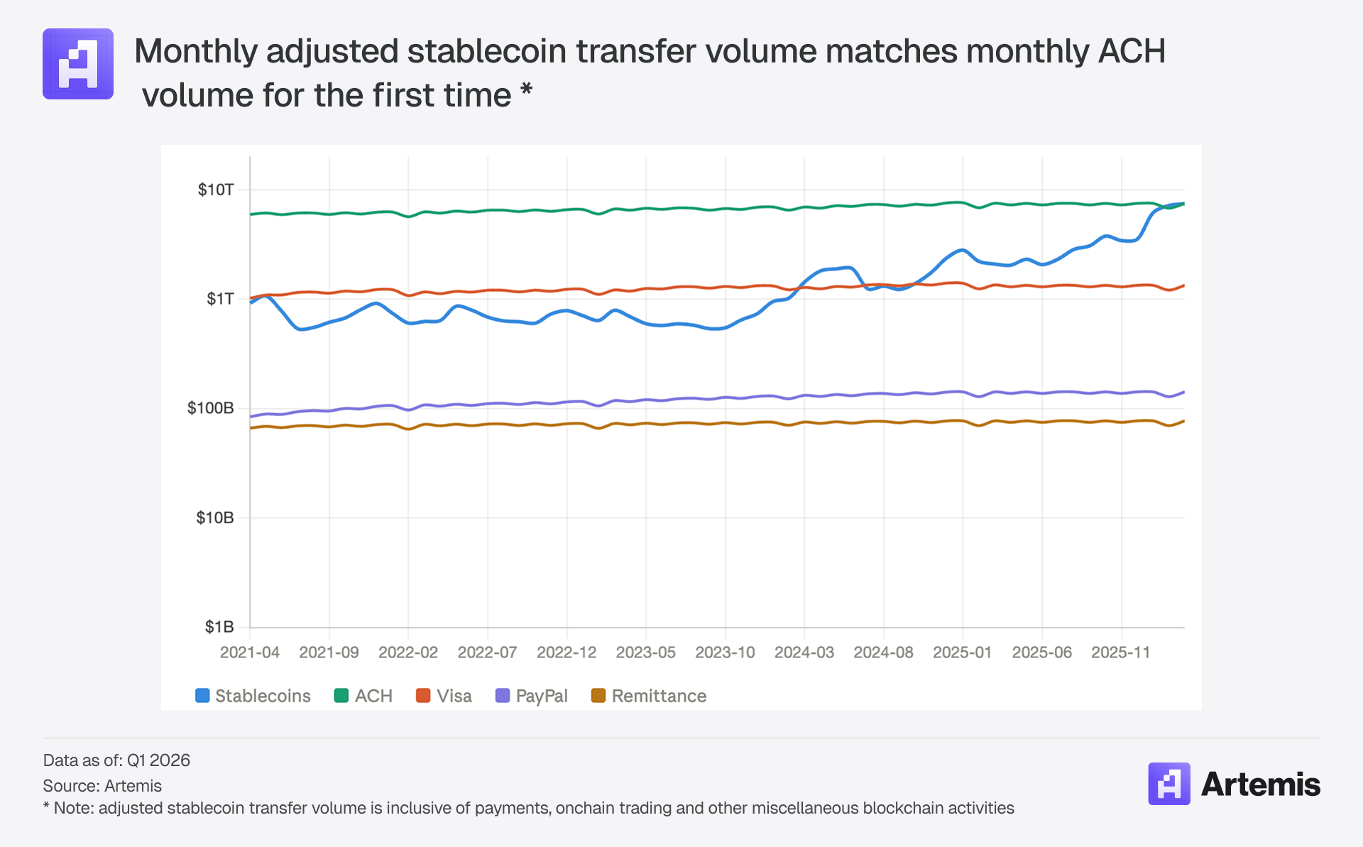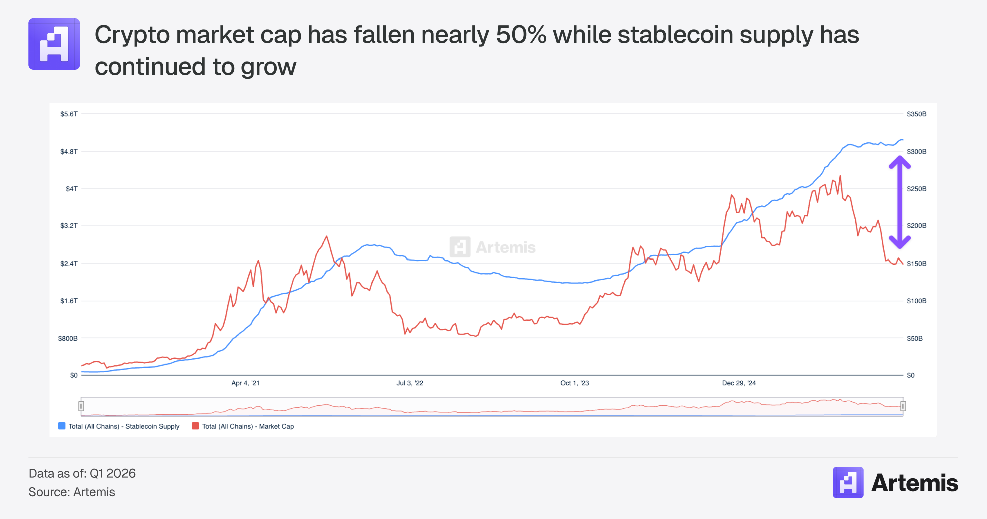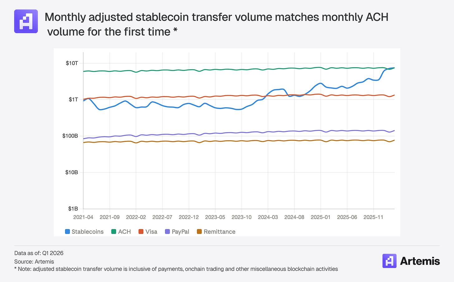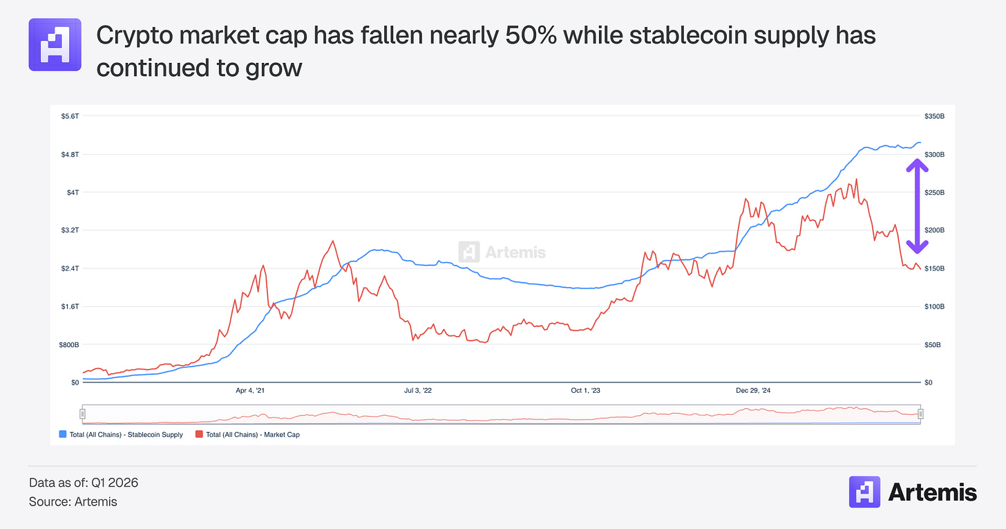 Stablecoins are at an inflection point. They are the first use case of blockchains that has found non-speculative product market fit. The proof is in the numbers: stablecoin payment volumes doubled in 2025 to $390 billion annualized, with key sectors like B2B payments growing 733% YoY (Artemis, McKinsey). While stablecoin payments still represent < 1% market penetration in key payment verticals, the growth is undeniable. 2025 was also a watershed year for stablecoins from a regulatory perspective. Passage of the GENIUS Act provided stablecoin issuers a regulatory framework for operating in the US. The result is that even though crypto market cap has fallen about 50% since 2025 highs, stablecoin supply has actually continued to grow, reaching $313bn by March 2026 (Artemis).
