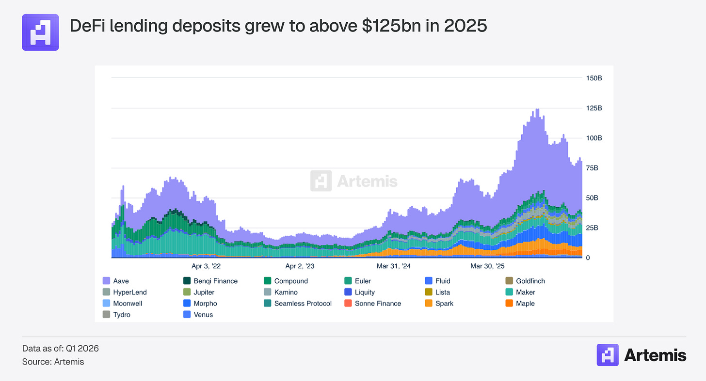 For years, decentralized finance was the territory of crypto-natives exploring the frontier of the onchain economy. While the world looked the other way, they created composable building blocks for global financial products. Aave has facilitated >$1 trillion in loans, making it the de facto place to borrow against your crypto. Morpho has built the infrastructure for curated, risk-isolated lending vaults that have attracted institutional capital, including a partnership with Apollo Global. Yield-bearing stablecoins like Sky’s sUSDS, Ondo’s USDY, and Ethena’s sUSDe grew 80% in 2025, outpacing growth of non-yield-bearing stablecoins (Artemis). These tokens allow holders to earn yield generated by lending activities, treasury yields or trading strategies.