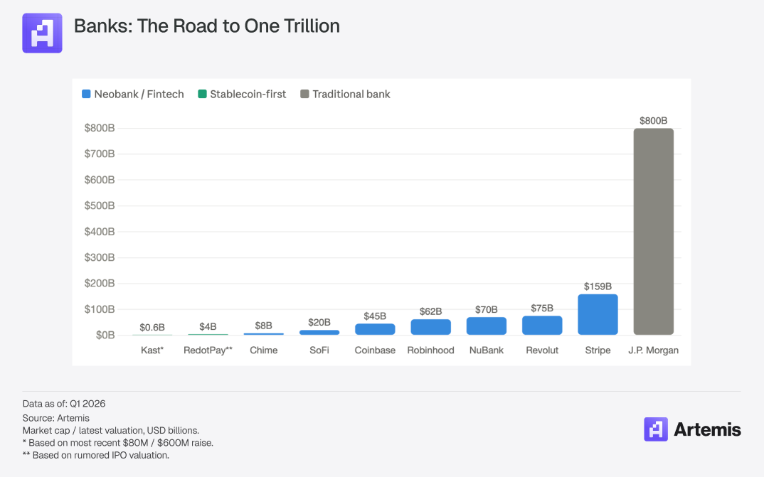 NuBank is valued at $70B, Revolut $75B, and Stripe $159B. J.P. Morgan, the world’s most valuable bank, has a market cap of about $800B, ten times that of NuBank or Revolut. JPM’s business model is meaningfully different including physical branches, corporate banking, investment banking, asset management. But the comparison is illuminating. A full-stack neobank with NuBank’s efficiency ratio (<20%), Revolut’s product breadth, and Coinbase’s blockchain integration (stablecoin yield, onchain rails, DeFi access) would have a revenue-per-user and margin profile that traditional banks cannot match.