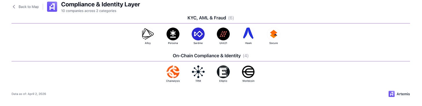 On the blockchain side, firms trace onchain transactions to flag illicit activity. As stablecoins become more regulated, onchain compliance becomes more important — you need to know that the USDC flowing through your neobank didn’t originate from a North Korean wallet.