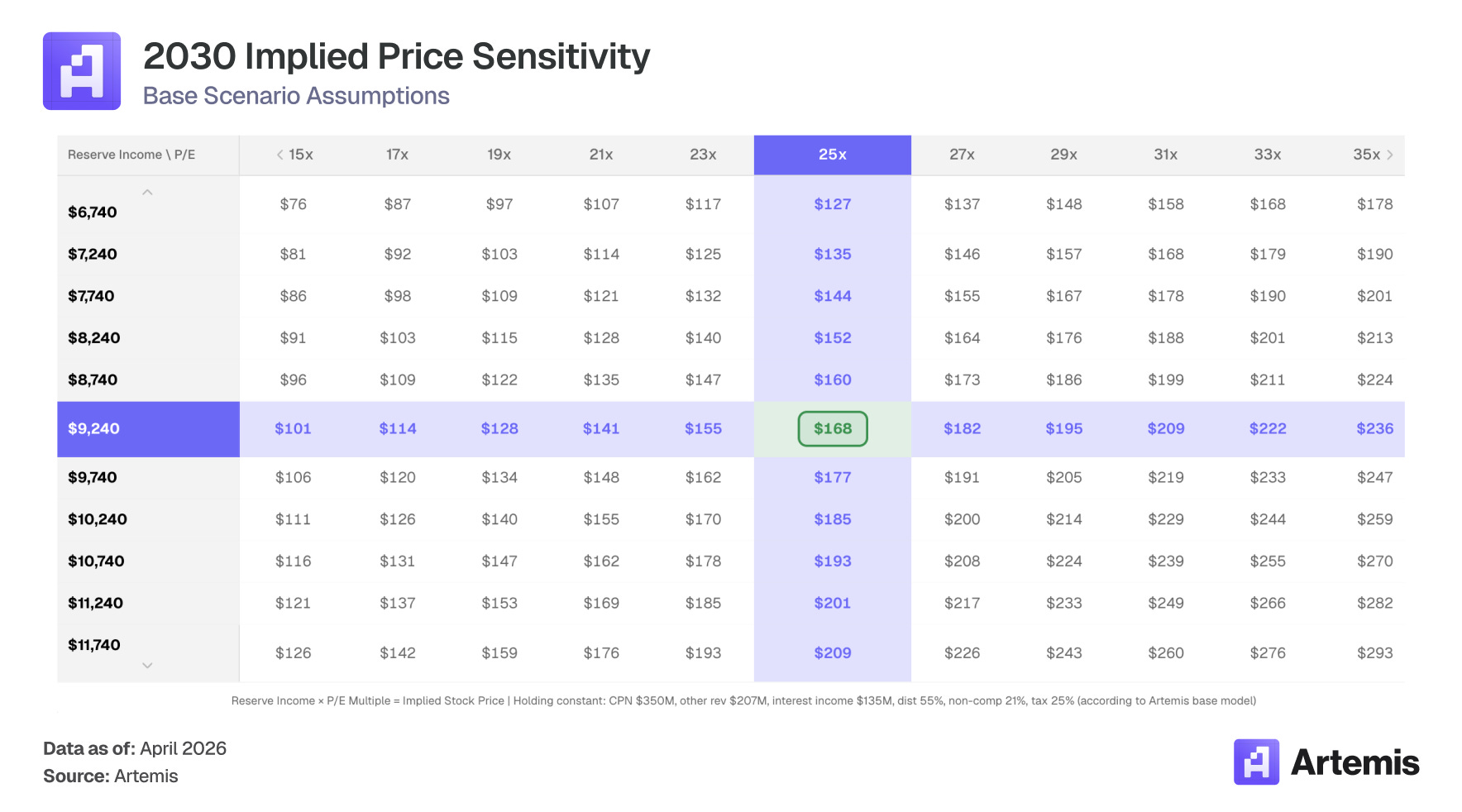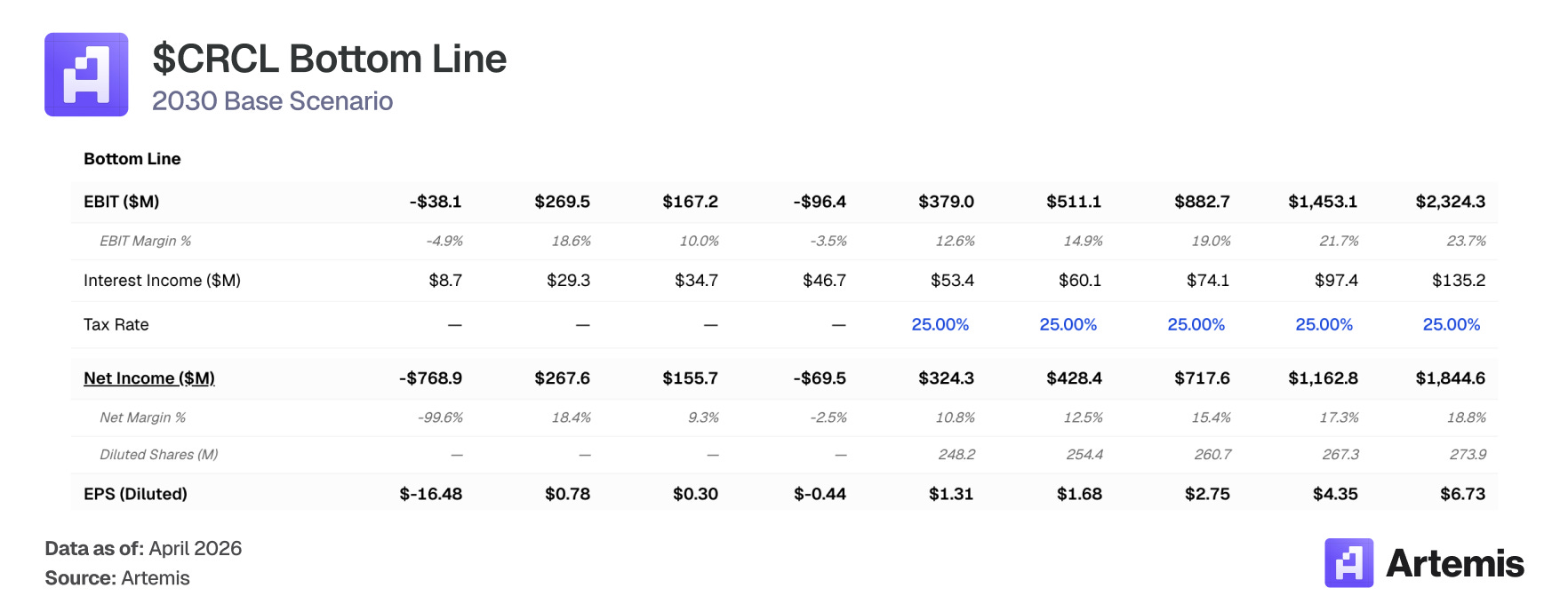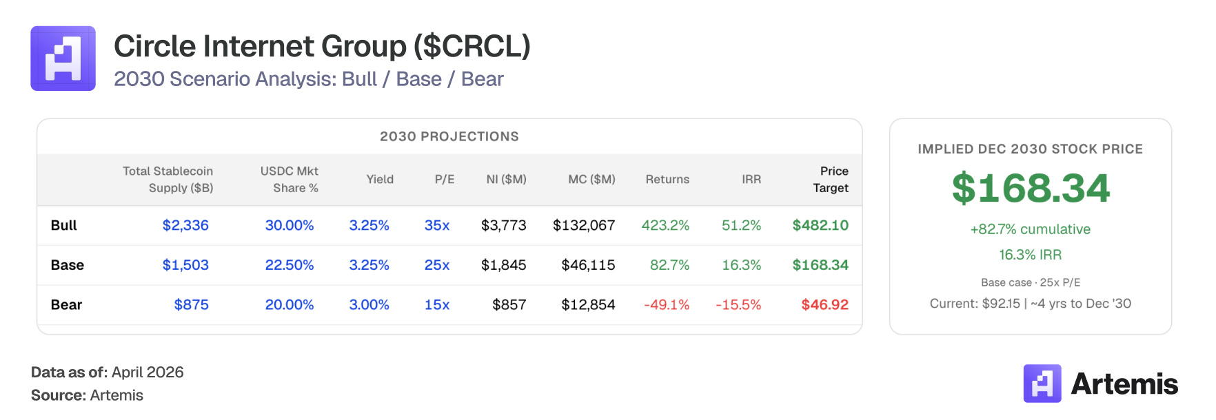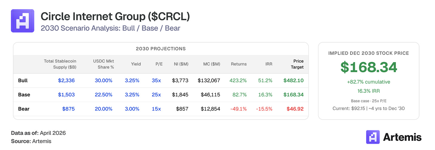 We value CRCL using a terminal P/E on 2030E EPS. Our base case produces net income of $1.84 billion on 273.9 million diluted shares, yielding EPS of $6.73. A 25x terminal P/E — a premium to the comp-weighted average, reflecting Circle’s structural growth trajectory, CPN-driven revenue diversification, and regulatory moat— implies ~$168 per share in 2030, representing 83% upside from current levels.