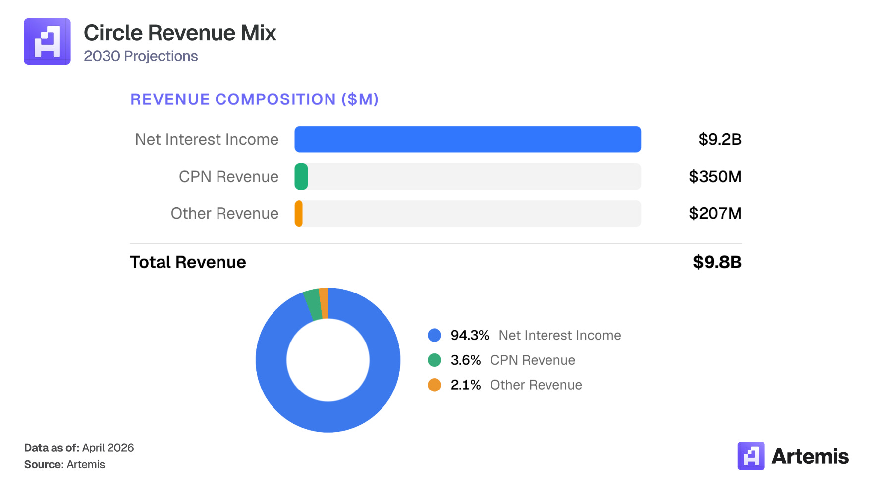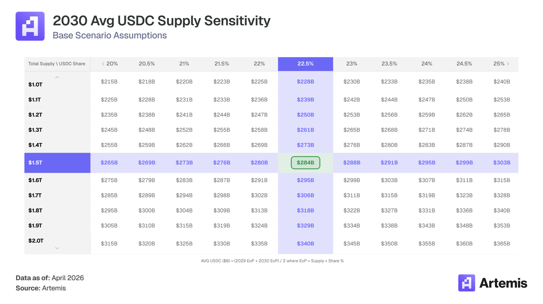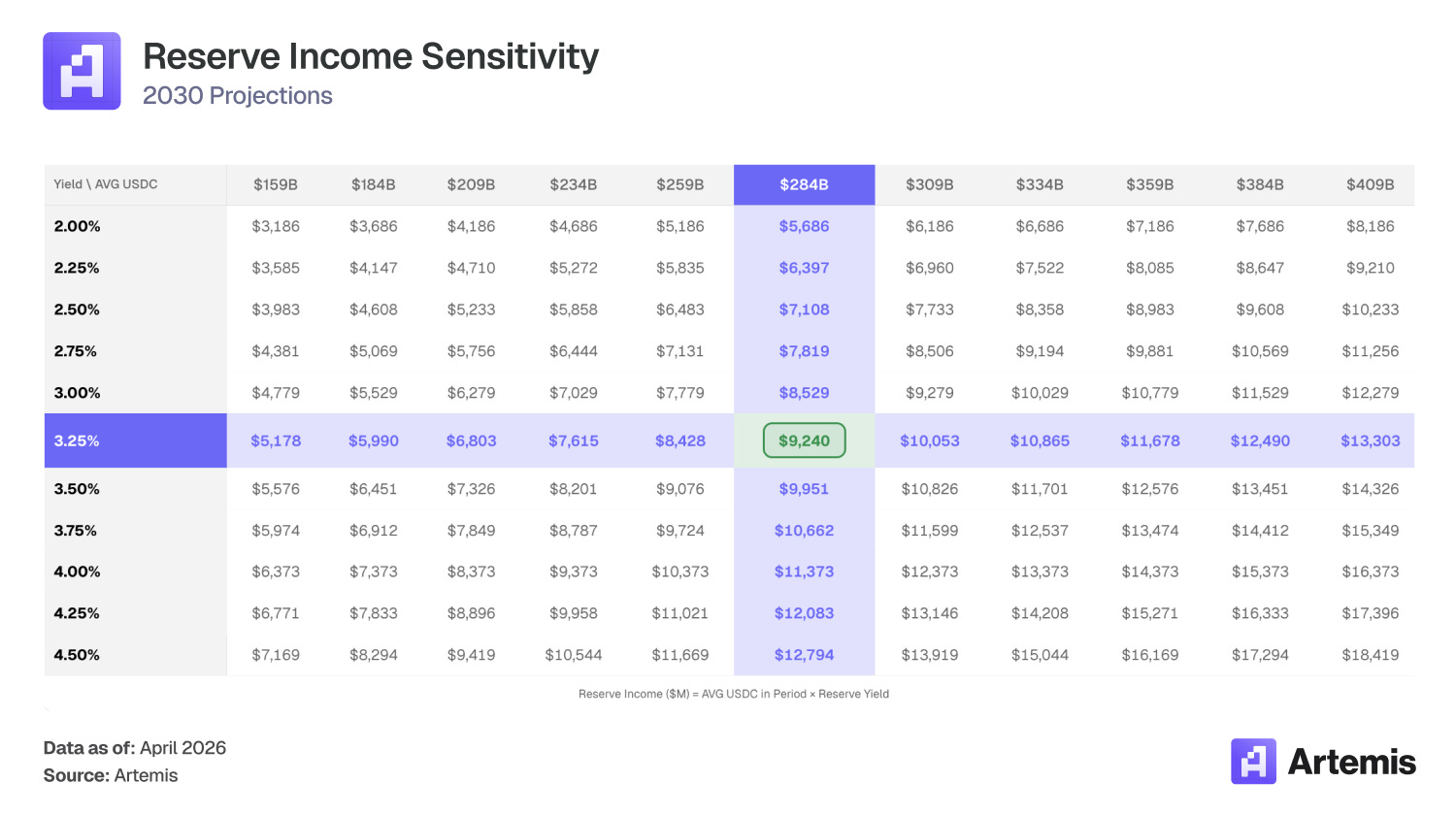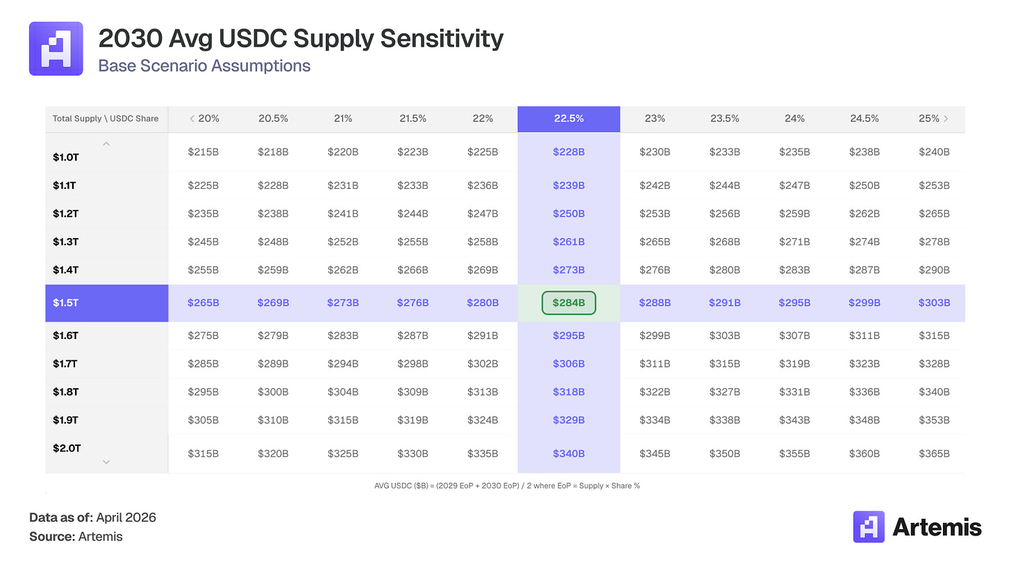 Mitigant: Even at a 2.5% yield, $284B in average USDC produces $7.1B in reserve income, which is still 2.7x the $2.64B earned in 2025 at 4.19%. Supply growth overwhelms all but the most extreme rate scenarios.