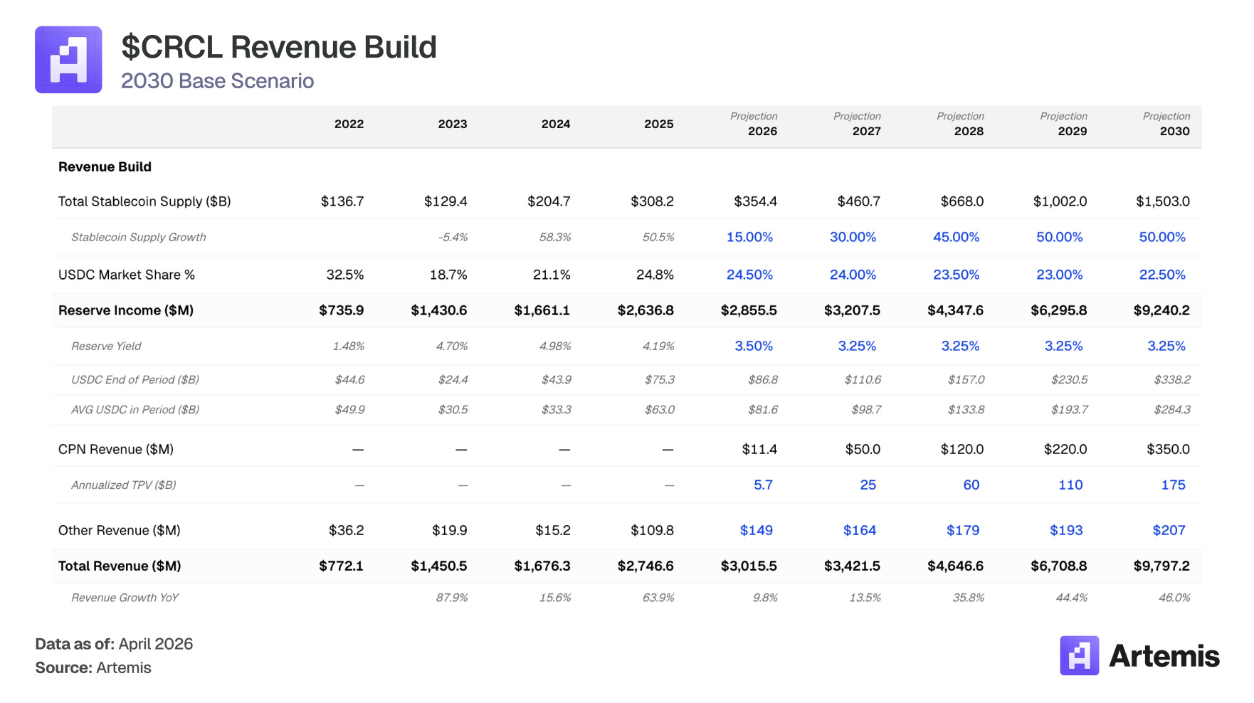 The market is pricing Circle as a rate-sensitive money market fund — a bet on the Fed Funds Rate sitting on blockchain rails. We think this framing misprices the business. USDC supply grew 72% in 2025 to $75.3 billion even as the Fed cut rates 75bps over the second half of the year, demonstrating that USDC demand is driven by genuine utility adoption rather than pure yield-seeking behavior. Our base case projects the total stablecoin market reaching ~$1.5 trillion by 2030, with average USDC supply at $284B billion. Even with reserve yields expected to compress, we expect Circle’s reserve income to grow to $9.2 billion in 2030 (~3.5x from 2025) as supply growth overwhelms rate compression. Combined with Circle Payments Network (CPN) scaling to $350 million in revenue and distribution costs declining from 60% to 55%, our base case projects total revenue of $9.8 billion and net income of ~$1.8 billion by 2030.