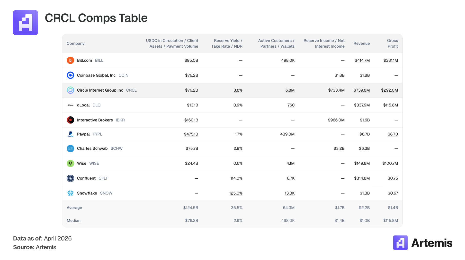 There is no direct public comp for a stablecoin issuer monetizing reserve float. Our comp set spans companies that share key attributes of Circle’s business: float-based revenue models (Schwab, Interactive Brokers), digital payments infrastructure (PayPal, Wise, dLocal, Bill.com), crypto-native platforms (Coinbase), and high-growth infrastructure with usage-based economics (Snowflake, Confluent).