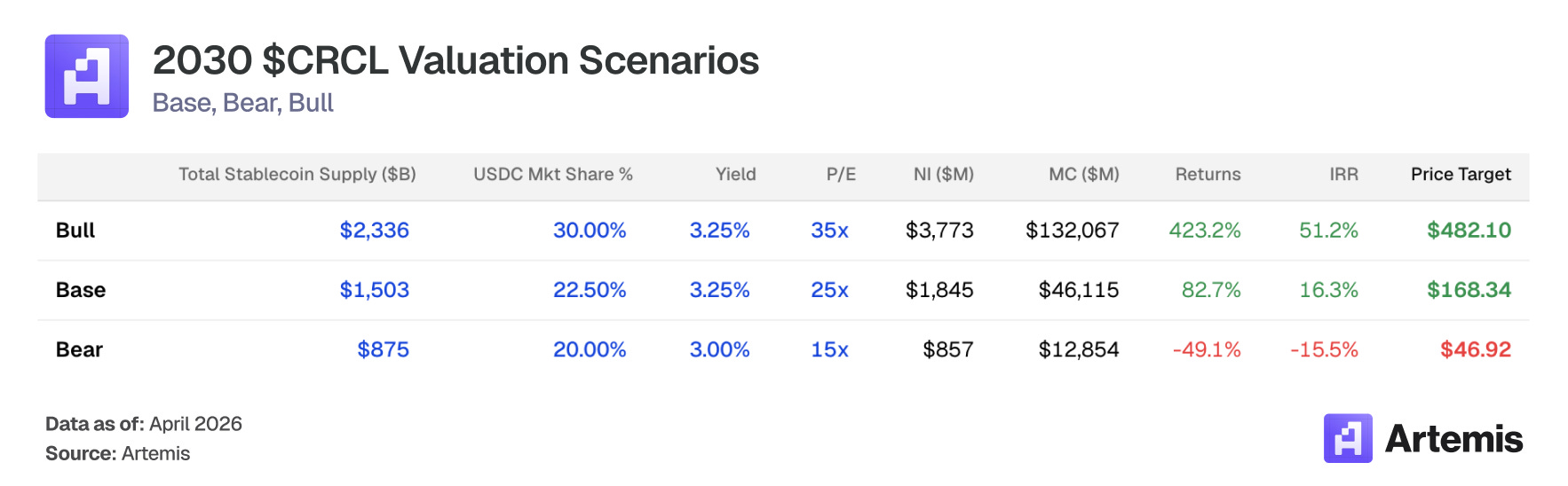 Base Case: Assumes continued execution on supply growth and CPN scaling, with the stablecoin market reaching $1.5 trillion and USDC maintaining 22.5% share. Distribution costs decline modestly to 55% as new financial institution partners negotiate lower revenue shares. Exit at a 25x terminal P/E on 2030E earnings, implying a price target of $168.34 — 82.7%% upside with a 16.3% IRR.