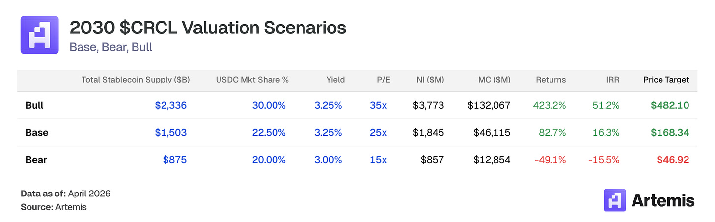 At the current stock price, a reverse-DCF implies the market is discounting ~$120–150 billion of USDC supply by 2030, which is roughly a 60–100% increase from today. Our base case models a 350% increase. That gap is the core of the investment case.