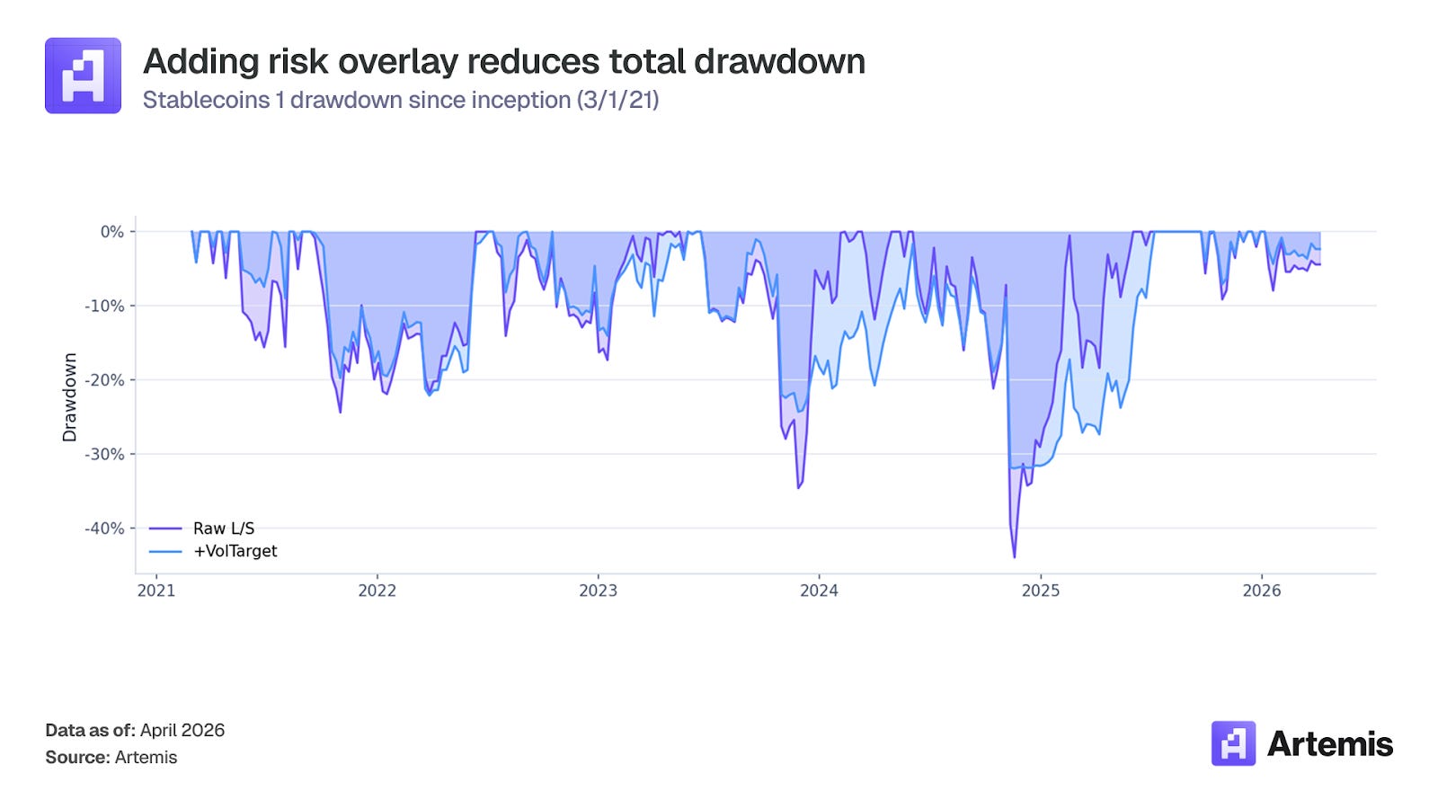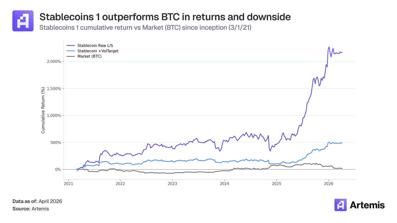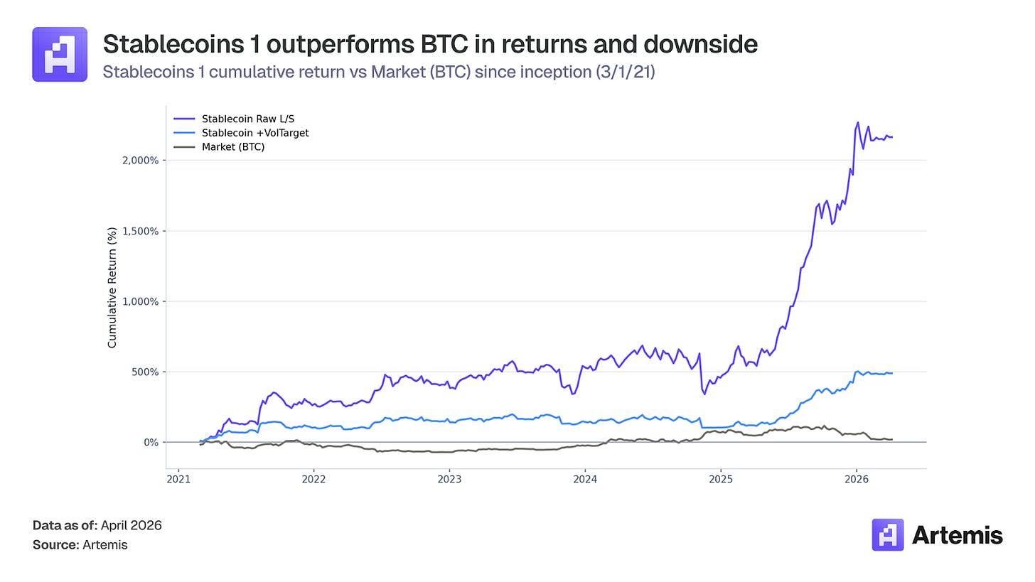 This asymmetry makes Stablecoins 1 valuable as a portfolio diversifier as its return stream actively profits during crypto bear markets.