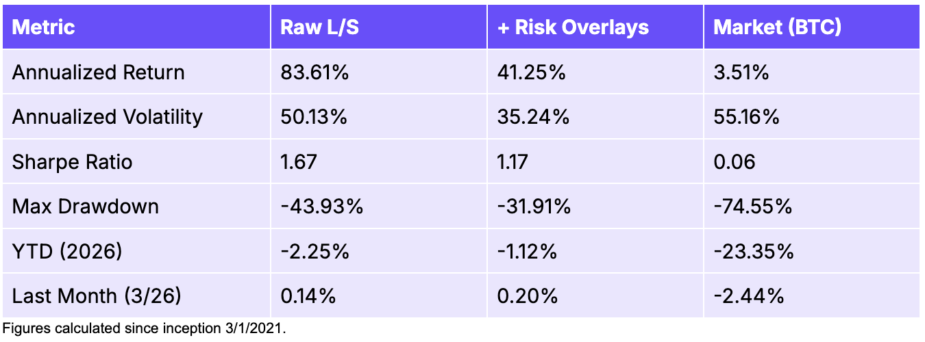 The raw long-short factor has essentially zero market beta (-0.03) and an R² of just 0.1%, meaning less than one-tenth of one percent of the factor’s return variation is explained by whether crypto is going up or down. A t-test on the null hypothesis that beta equals zero fails to reject (p = 0.65), confirming that the long-short construction is statistically indistinguishable from market-neutral. After applying the risk overlay, market beta moves slightly to -0.04 with an R² of 0.4% and is still not statistically different from zero (p = 0.32).