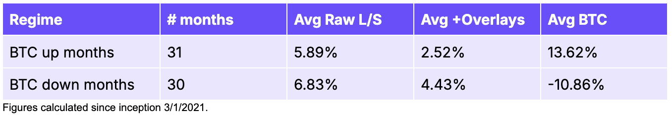 The more interesting property is the factor’s behavior across market regimes. We split the backtest into months where BTC was positive (31 months) and months where BTC was negative (30 months) and measured the factor’s performance in each.