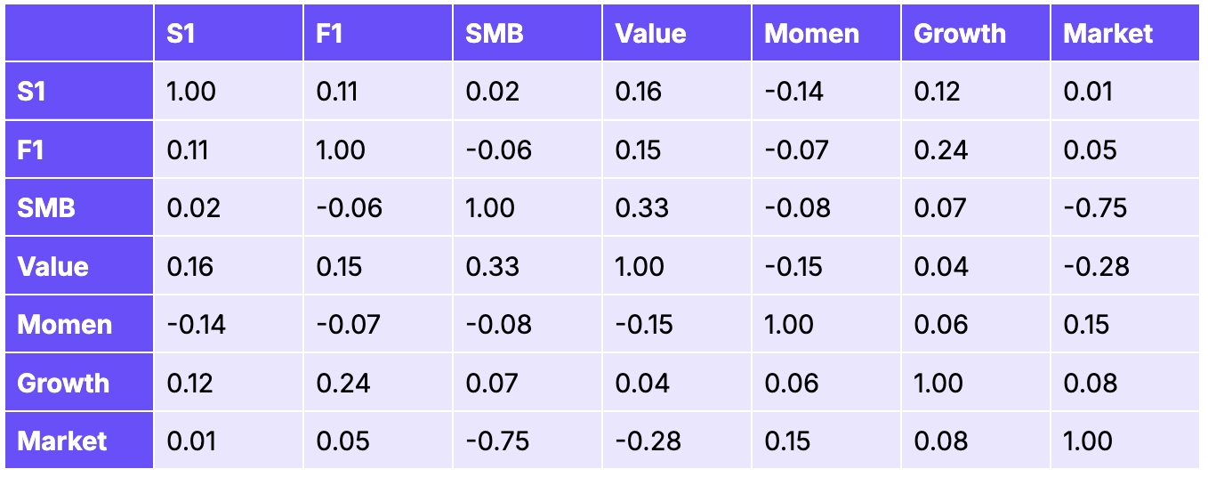 We wanted to ensure that Stablecoins 1 is capturing return variation not already covered by factors we already have. To evaluate this, we computed the pairwise correlation between the Stablecoins 1 (S1) and every other factor in our research stack: Fundamentals 1 (F1), SMB (size), Value, Momentum (Momen), Growth, Market (BTC).