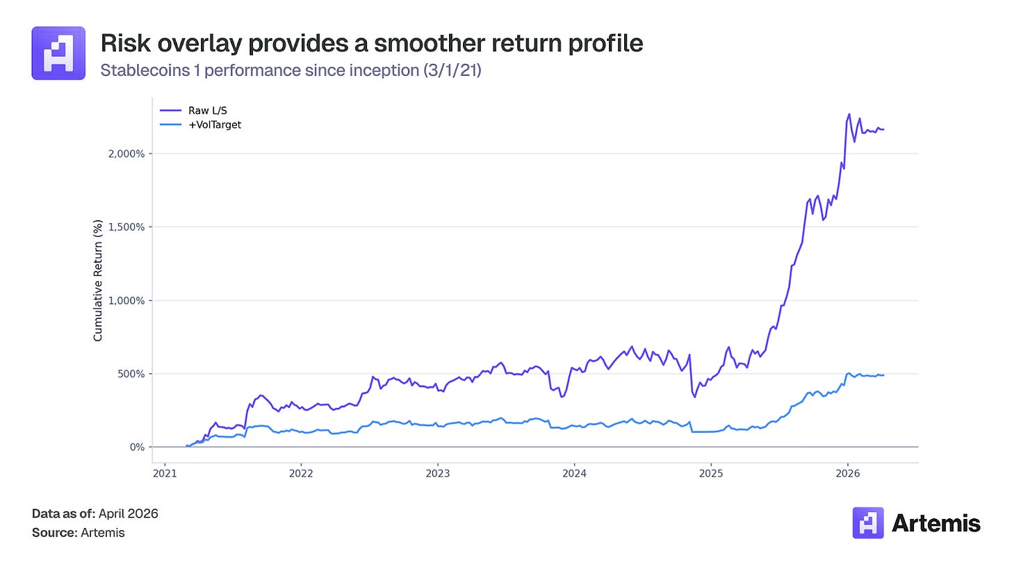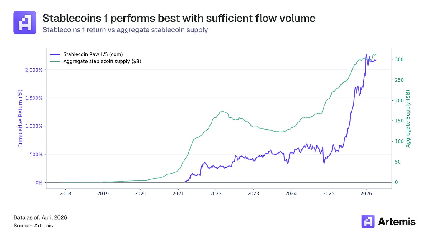 Performance has been resilient across multiple market regimes, with strong years in 2021 (+262%), 2022 (+47%), and 2025 (+315%). Stablecoins 1’s one losing year (2024, -13%) coincided with stagnant aggregate stablecoin supply growth, and performance recovered immediately when the ecosystem resumed expanding.