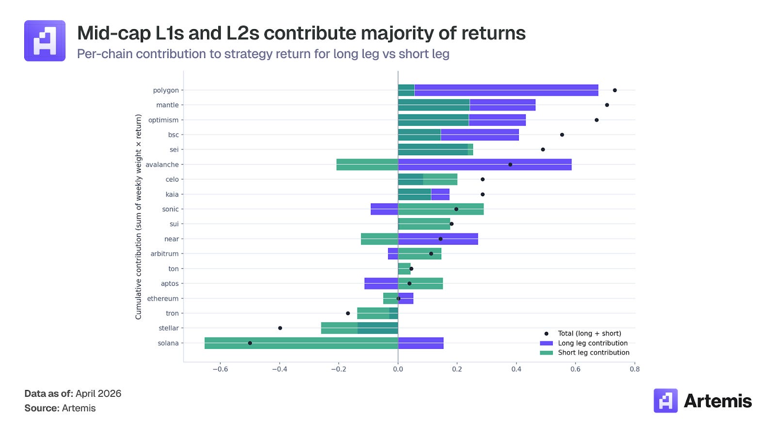 The alpha comes from being long mid-cap chains. The long leg generates 84% of returns, and the top five contributors (Polygon, Mantle, Optimism, BSC, Sei) account for 84% of total returns.