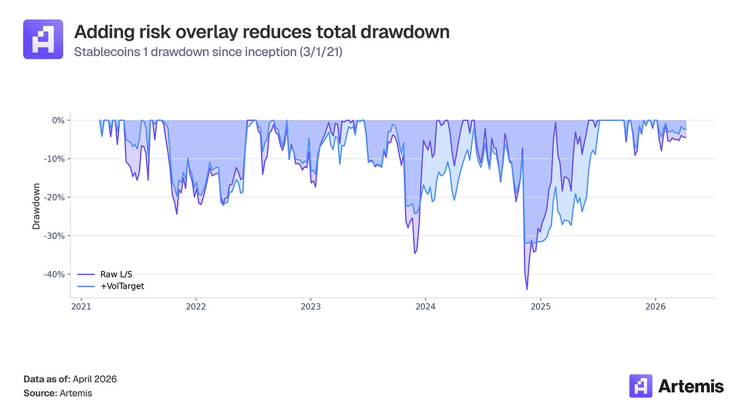 We also explored adding risk overlays to limit downside. Positions are scaled each week to target 20% annualized realized volatility with a leverage cap of 1.5x, and exposure is further reduced during deep drawdowns measured against a rolling peak. Using a rolling peak ensures that we can resume the full-size trading strategy after extended flat periods, avoiding permanent deleveraging after a deep drawdown. Unlike Fundamentals 1, there’s no BTC regime filter because the factor naturally backs off during down crypto markets as capital leaves, stablecoin supply contracts, and the strategy’s exposure shrinks.