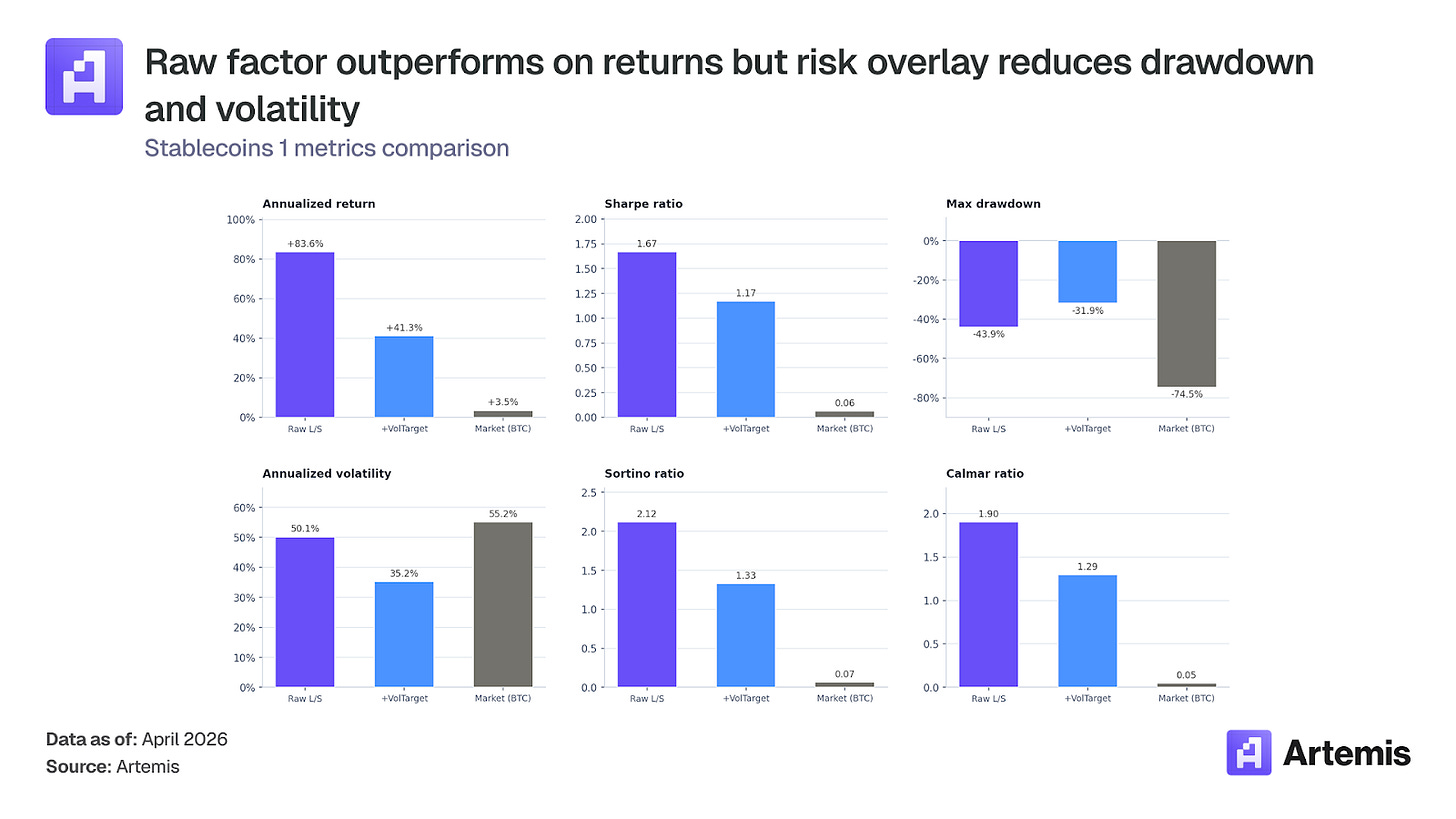 It performs best in down markets. Across 30 BTC-negative months in the backtest, the raw factor averaged +6.8% per month while BTC averaged -10.9%. Stablecoins 1 doesn’t just survive crypto bear markets, it actively profits from them.