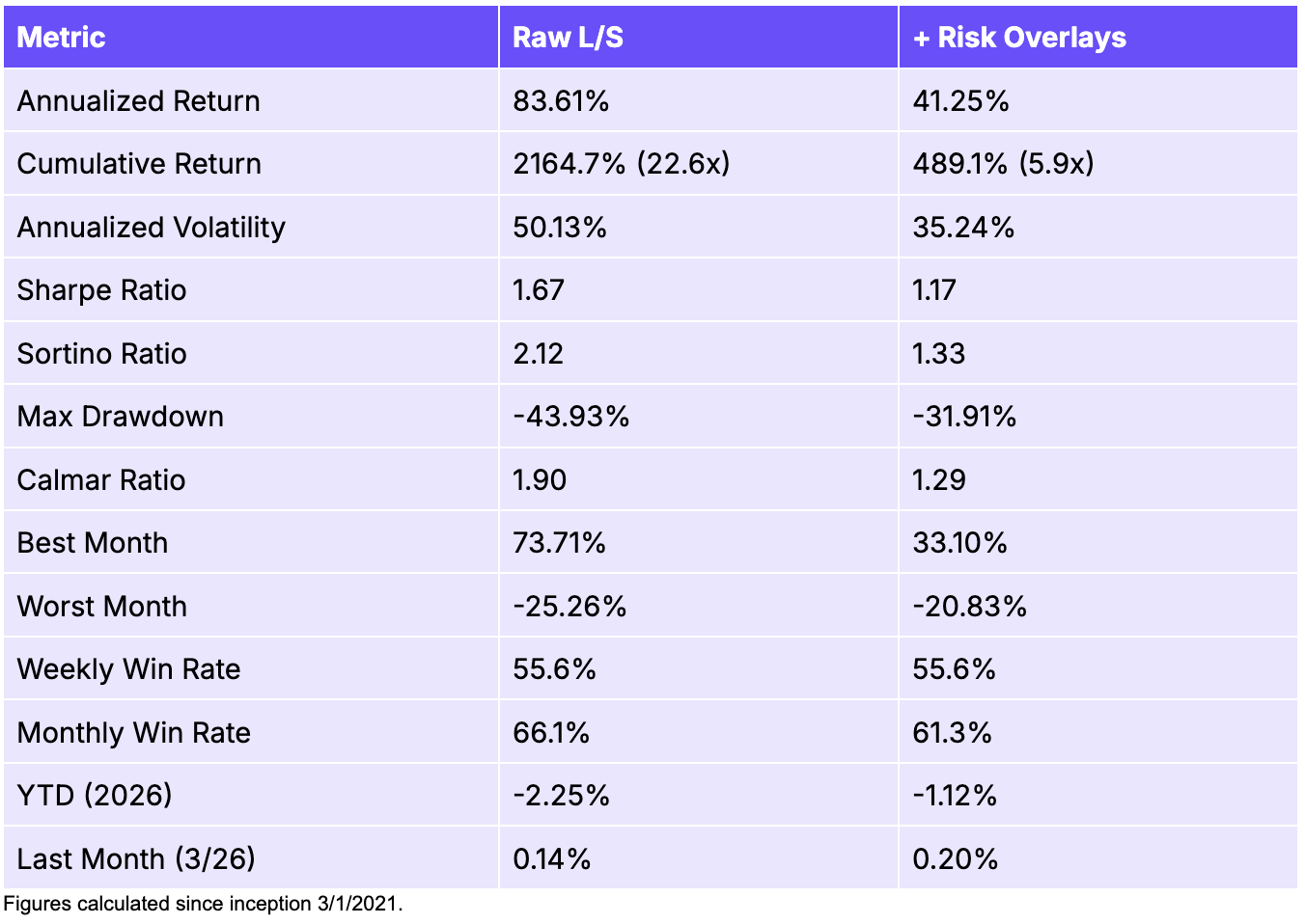 The raw long-short strategy delivers the highest annualized return (+83.6%) and the best Sharpe (1.67), with cumulative returns of +2,164% since inception. Adding the risk overlay reduces the Sharpe to 1.17 but also cuts the max drawdown from -43.9% to -31.9% and the worst month from -25.3% to -20.8%. The risk overlay trades roughly half the raw return in exchange for a meaningfully smoother profile.