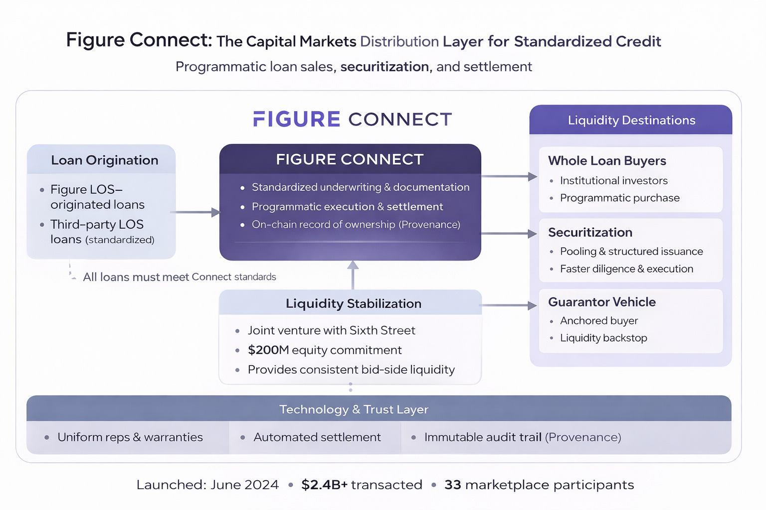 Figure Connect enables Figure-Branded and Partner-Branded loans to be distributed to institutional investors through standardized, programmatic workflows, rather than bespoke bilateral transactions, anchored by Democratized Prime, which enforces uniform underwriting, documentation, and data standards inside Figure’s ecosystem. Blockchain underpins funding and post-origination as a system of record for ownership and settlement, with transactions settling via YLDS, FIGR’s SEC-registered, yield-bearing token. FIGR earns transaction and technology fees, positioning Connect as a marketplace layer that enhances liquidity and execution efficiency in private credit markets.