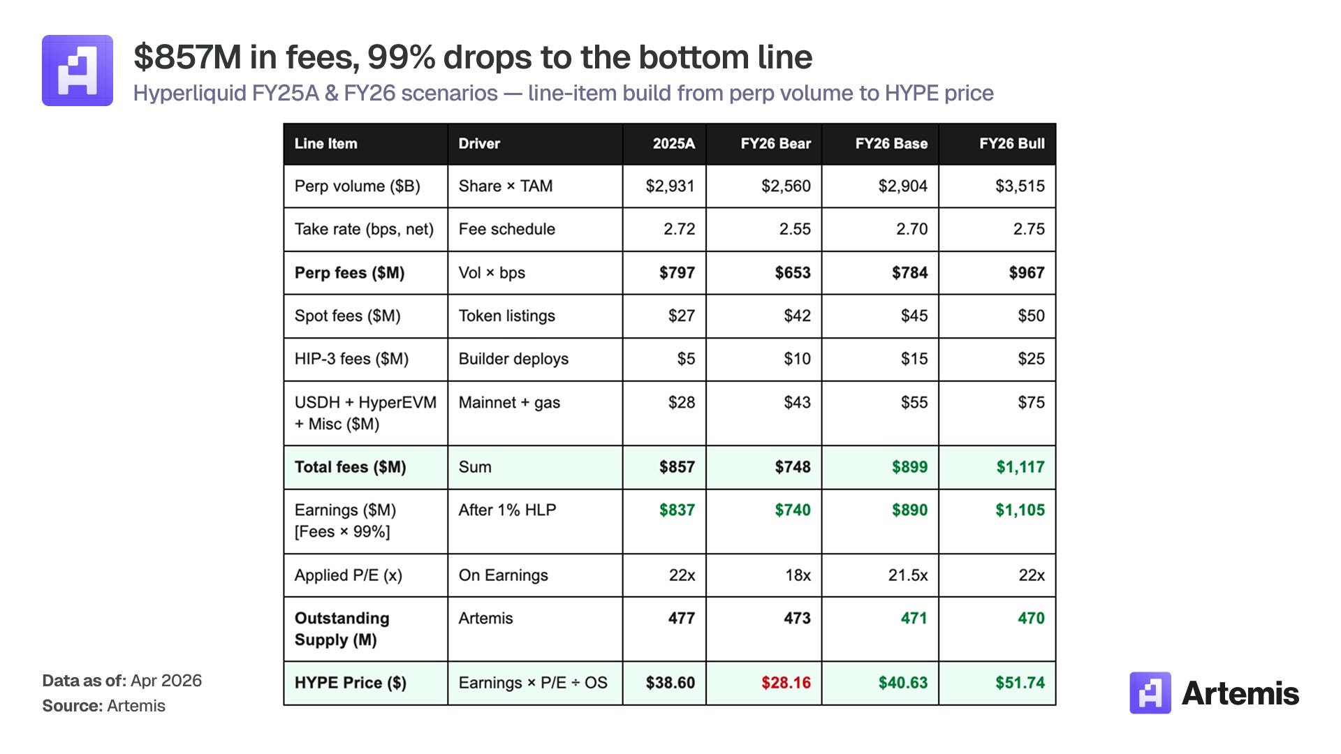 Mitigant: Zero liabilities mean no forced-seller dynamic. Even in the bear case, Hyperliquid still generates $782M of fees and $774M of earnings — the buyback-and-burn continues to exceed staking emissions, and the token remains deflationary (−23M HYPE/yr net). The $1B equity line is optional, not mandatory.