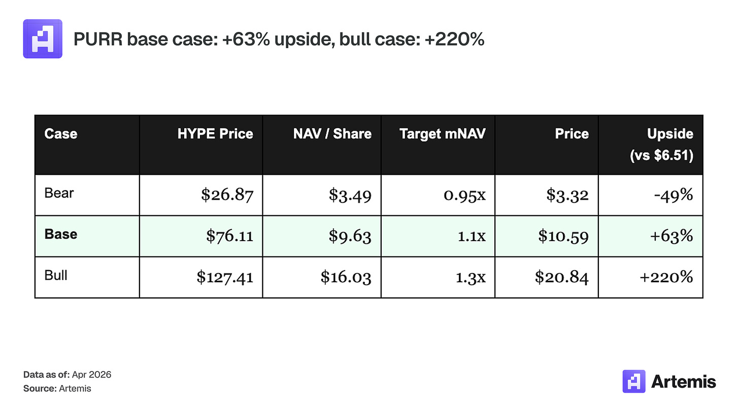 Any premium that opens above NAV in a rally can compress quickly when sentiment turns. Strategy’s 6x mNAV premium collapsed to 1.15x FD in under 12 months. In the bull case, PURR re-rates to 1.3x NAV ($20.84); if sentiment reverses and the multiple compresses back to 1.1x, the loss is capped at the mNAV delta.