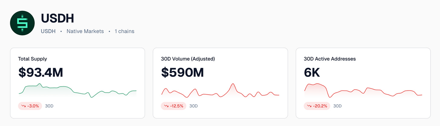 5. USDH: native stablecoin with revenue sharing. Native Markets won the USDH bid (Sept 2025). Reserves sit in a BlackRock-managed fund; 50% of reserve yield routes to the Assistance Fund.