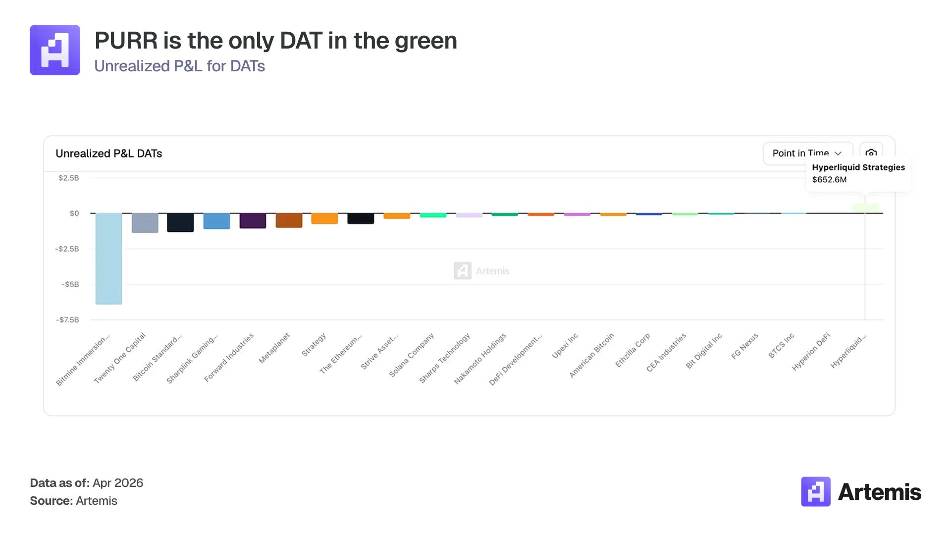 PURR is the only DAT sitting on meaningful unrealized gains, up roughly $600M on its HYPE position. The underlying asset isn’t just productive, it’s appreciating.