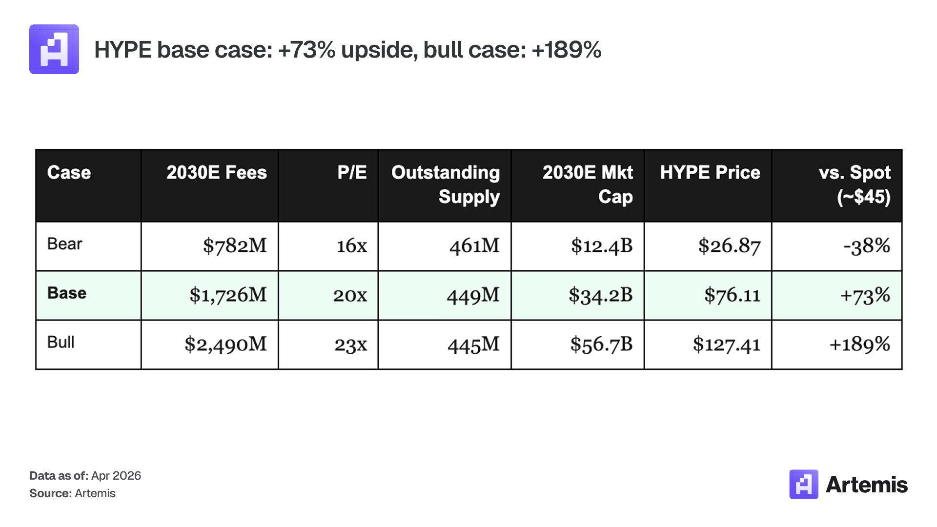 Bear case: HYPE compresses to $27, Adjusted NAV drops to $3.49, mNAV slips to 0.95x, implying $3.32 and –49% downside. Base case returns ~10% annualized, but the distribution is asymmetric: bear downside is floored by zero liabilities and a protocol that still generates $782M of fees at trough, while bull upside compounds from both HYPE appreciation and mNAV re-rating.